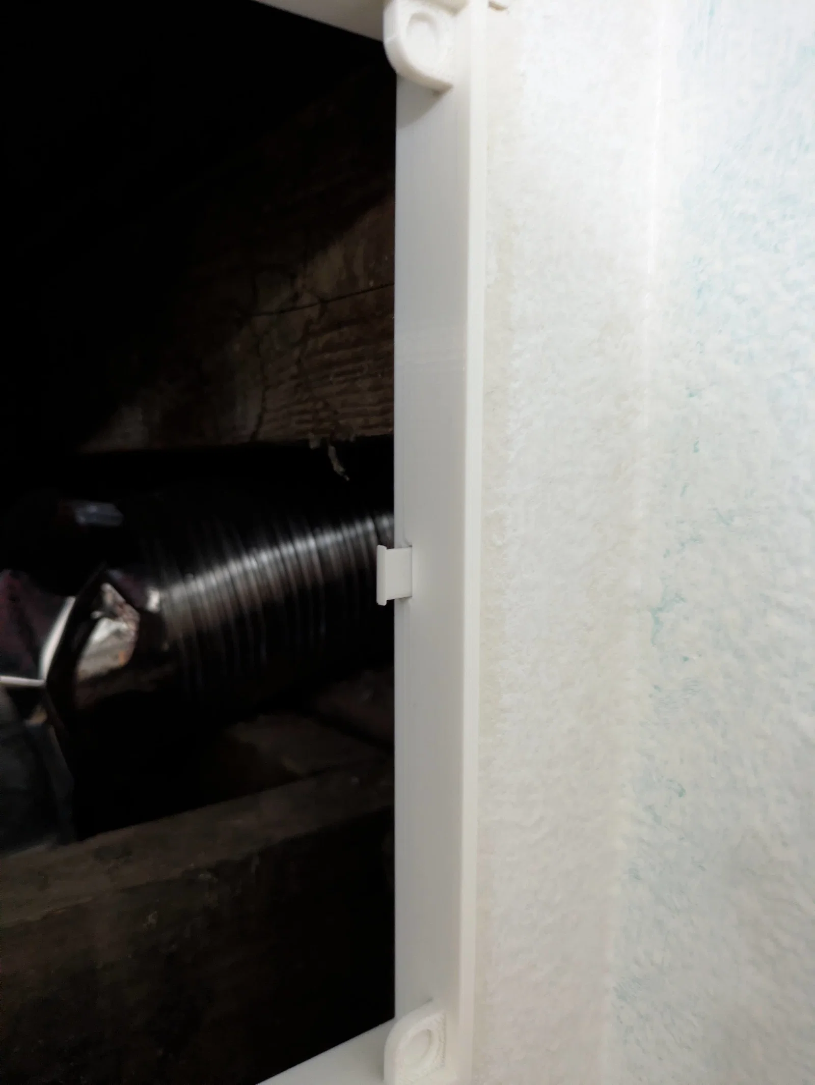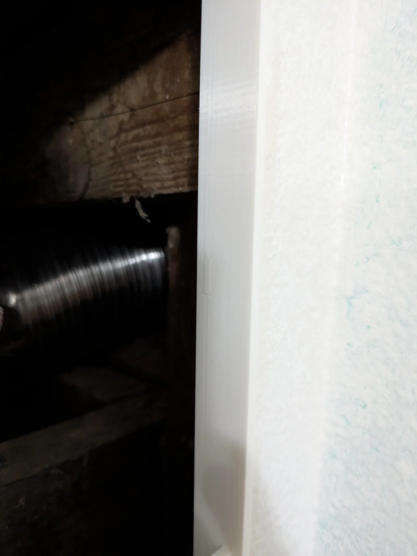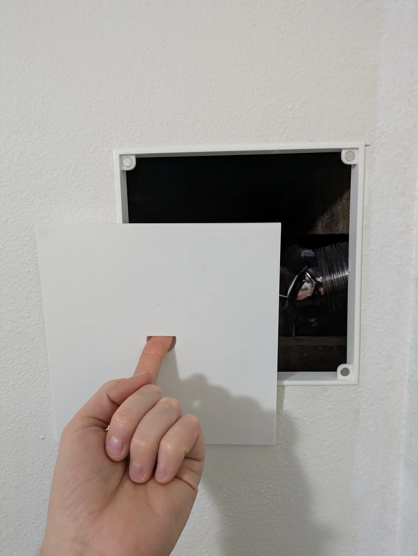 Mình có một chỗ nối ống thông gió máy sấy khá phiền phức mà mình cần phải truy cập thường xuyên để cố định, cũng như mở ra để vệ sinh. Cách dễ nhất là cắt một cái lỗ trên tường thạch cao. Mình đã cắt một cái lỗ kích thước 20cm x 20cm, vì biết nó nhỏ hơn khổ bàn in của mình. Sau đó khoảng 4 tháng, cuối cùng mình đã quay lại để thiết kế và in cái khung cùng nắp đậy tháo rời này, để trông nó thẩm mỹ hơn hẳn cái miếng giấy ăn mình đã dán tạm lên lỗ hổng trước đó.