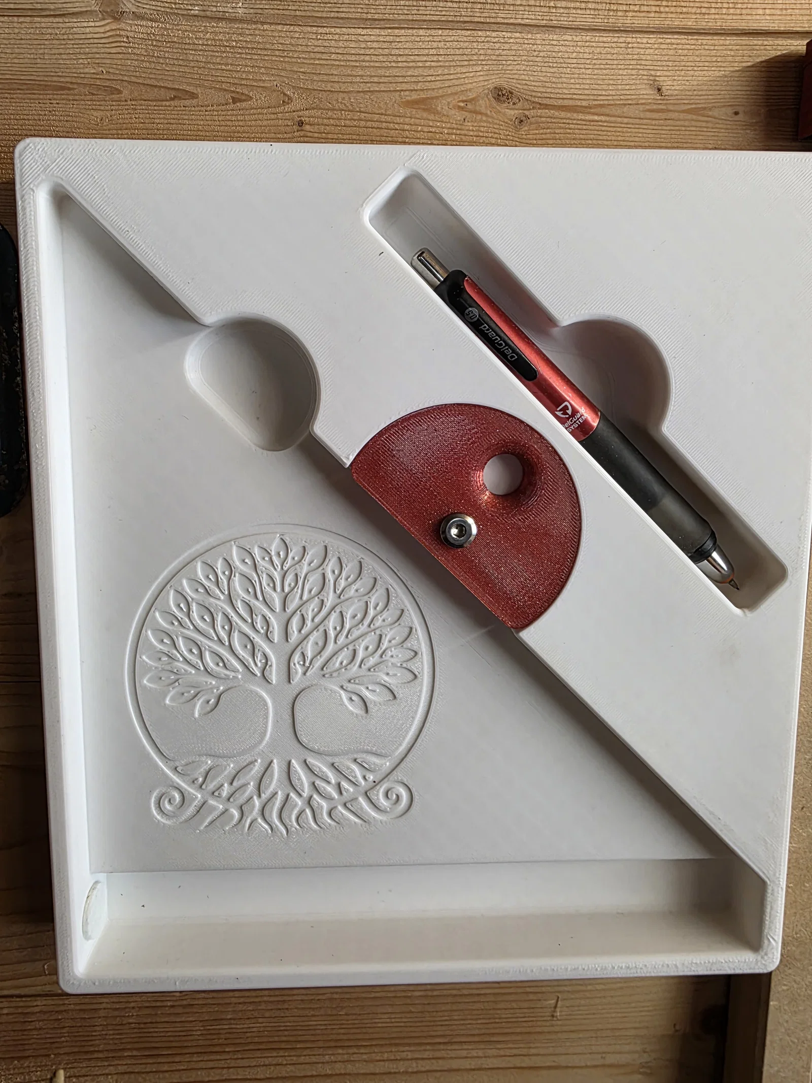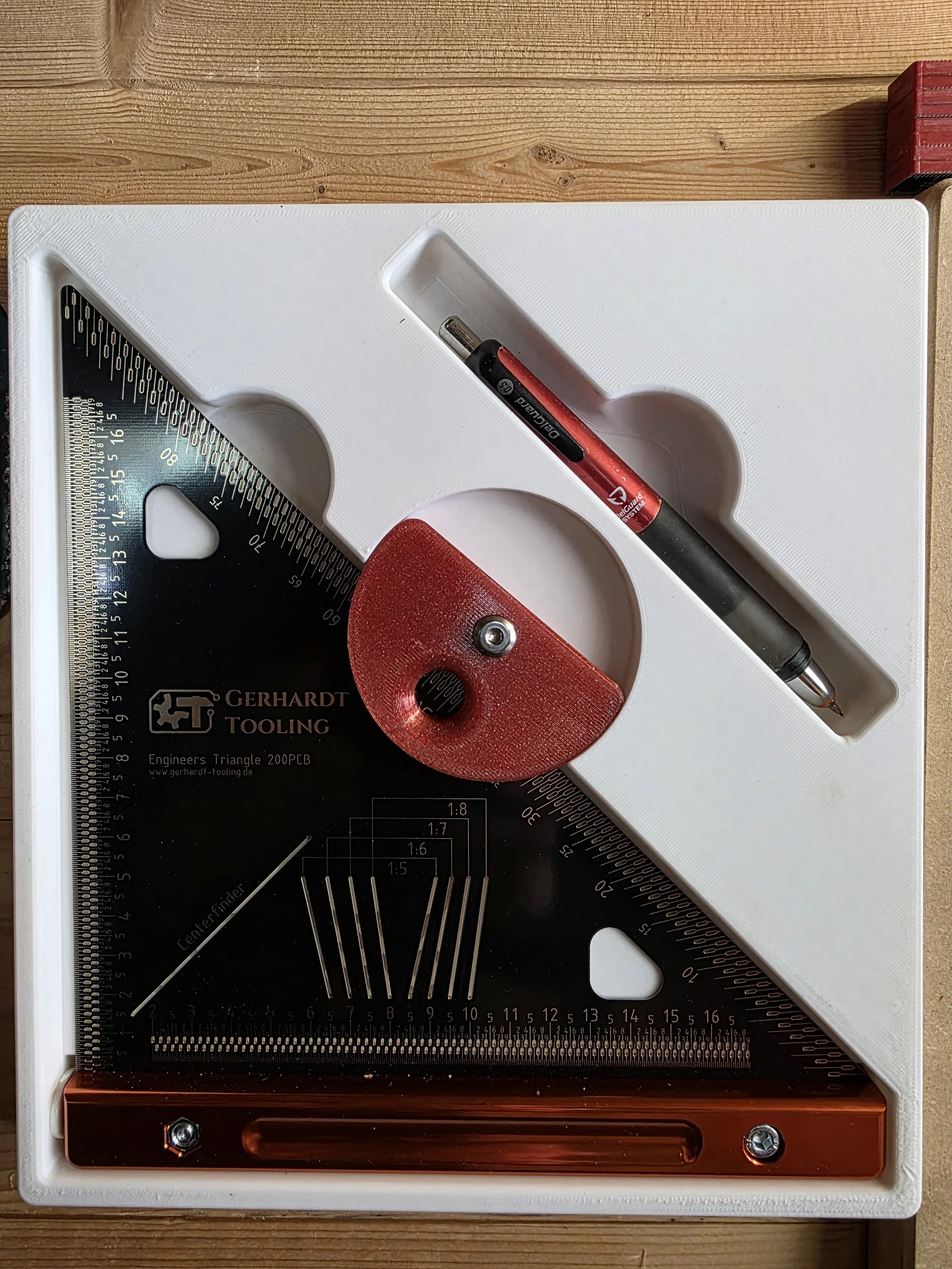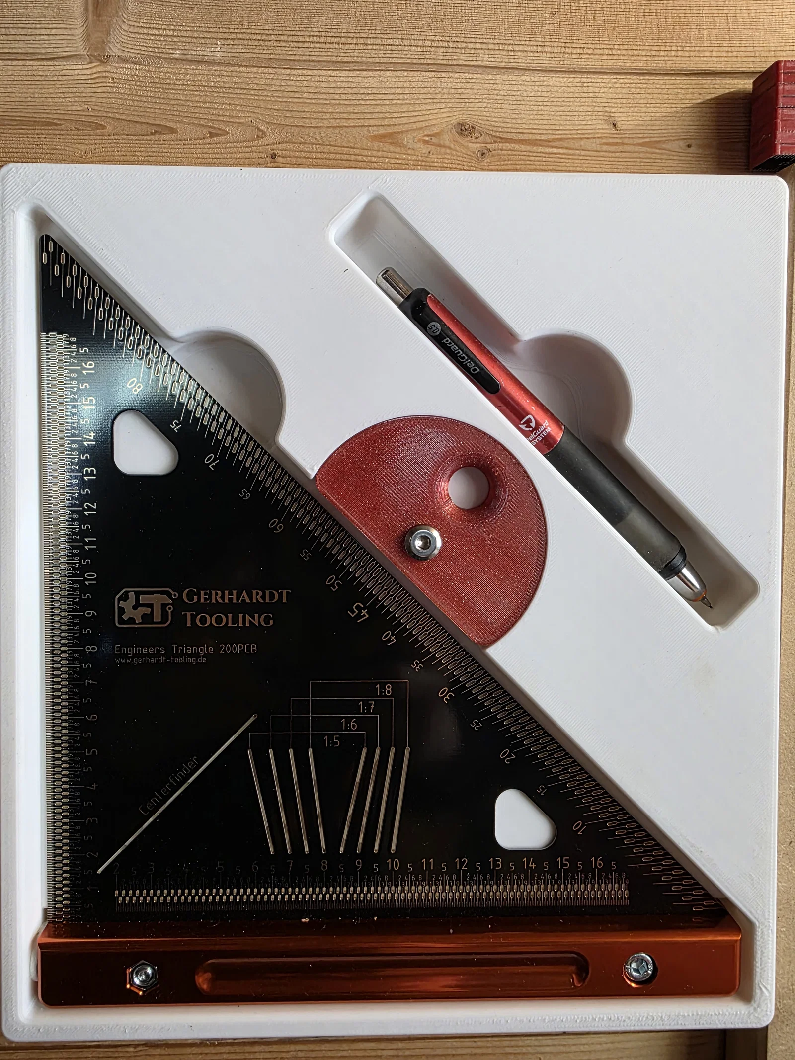 Giải pháp lưu trữ treo tường gọn gàng cho thước ke góc của thợ mộc, tích hợp thêm khe cắm bút tiện lợi. Thiết kế thẩm mỹ với cơ chế gắn ẩn, hoàn hảo để tối ưu hóa không gian làm việc của bạn.
