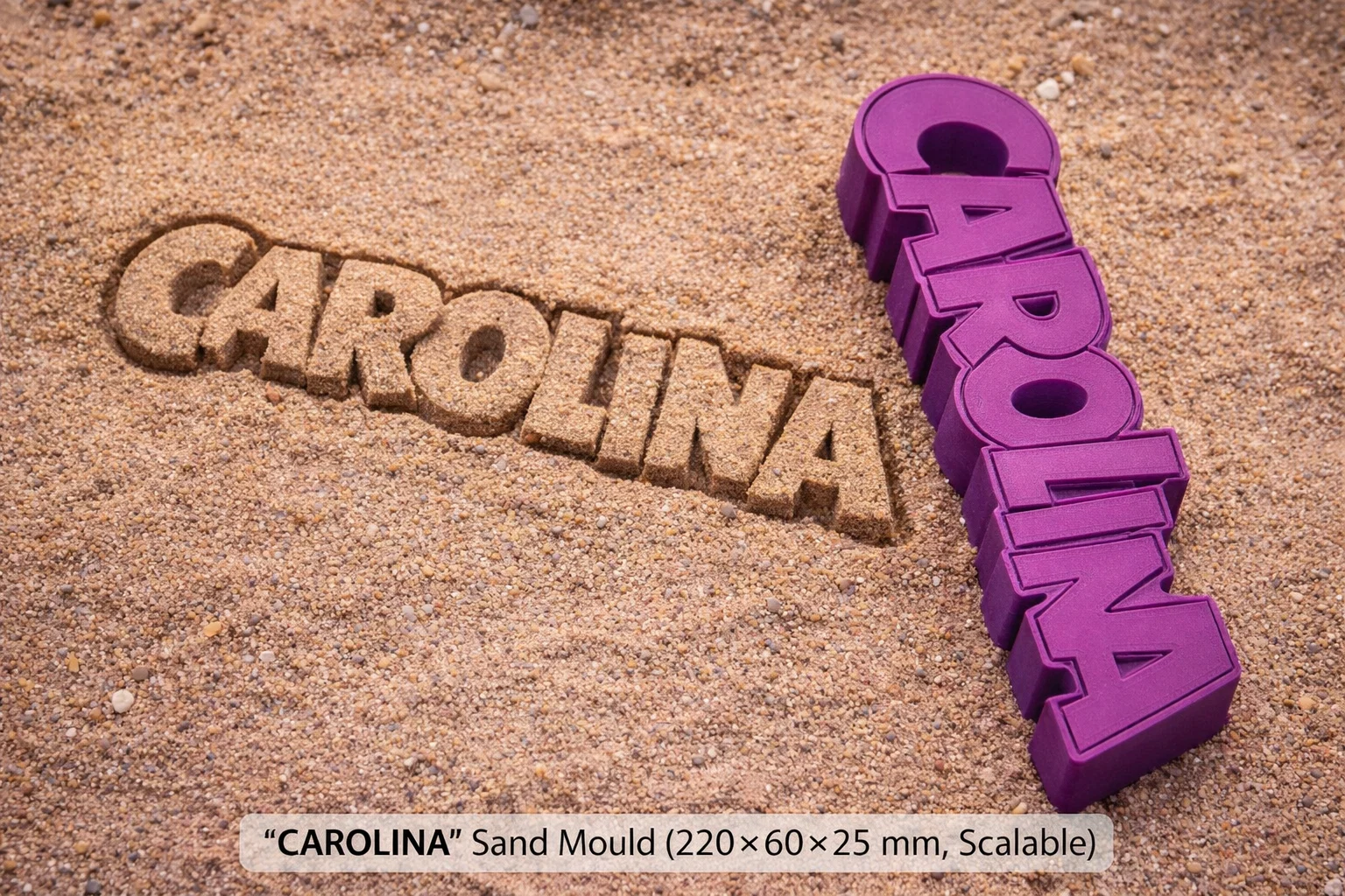 Tạo dấu ấn cá tính với khuôn in cát 3D “Carolina”. Kích thước 220×60×25 mm, dễ dàng in mà không cần support, phù hợp cho bé chơi trên cát hoặc bãi biển. Bạn có thể thoải mái tùy chỉnh kích thước lớn nhỏ tùy ý.