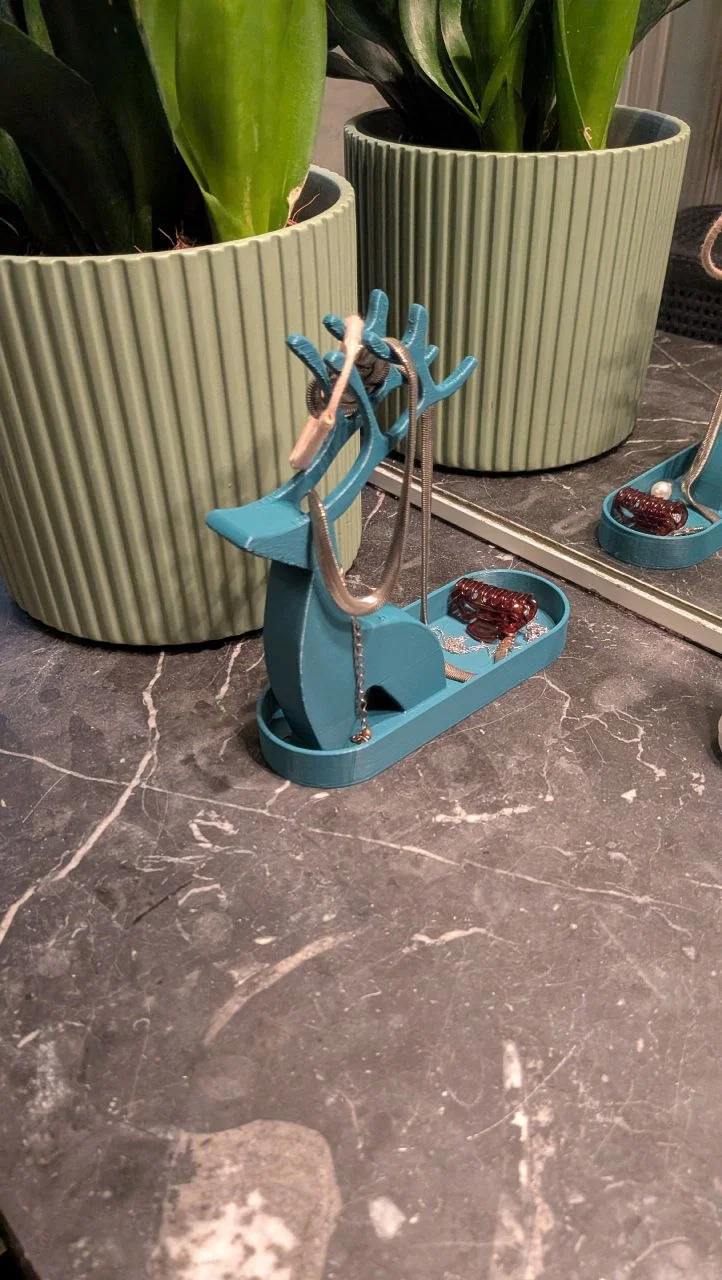 Đây là một mẫu giá treo trang sức nhỏ gọn, tinh tế với hình dáng chú hươu có cặp gạc phân nhánh, cực kỳ lý tưởng để treo vòng cổ, vòng tay và dây chuyền. Phần khay hình bầu dục tích hợp ở đế giúp bạn để nhẫn, bông tai và các phụ kiện nhỏ khác thật ngăn nắp và dễ tìm.