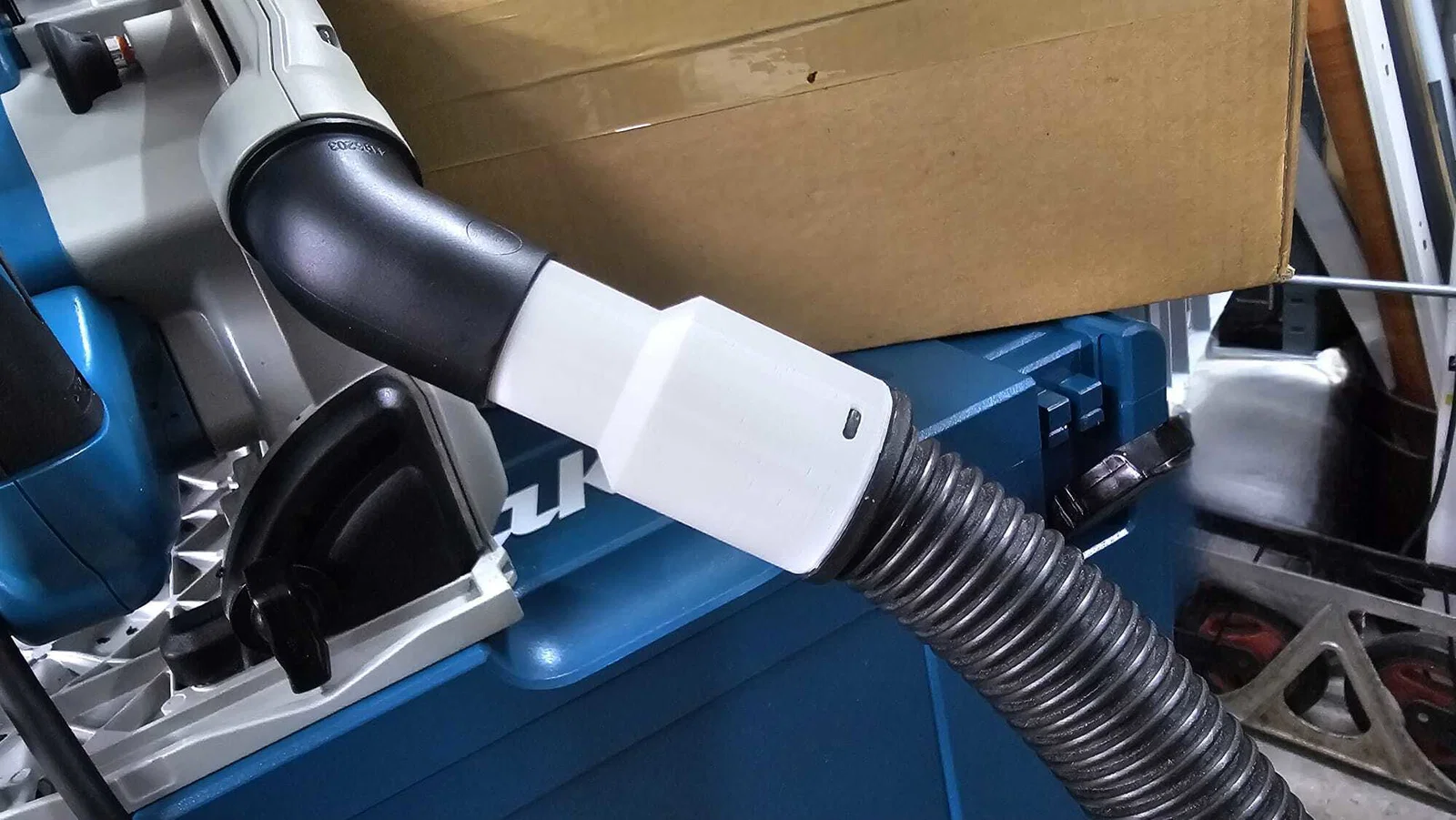 Bộ chuyển đổi hút bụi thiết kế chuẩn xác, chắc chắn và không bị lỏng, giúp kết nối máy Kärcher WD 2.500 M với máy cưa Makita SP6000 mà không cần dùng vít.