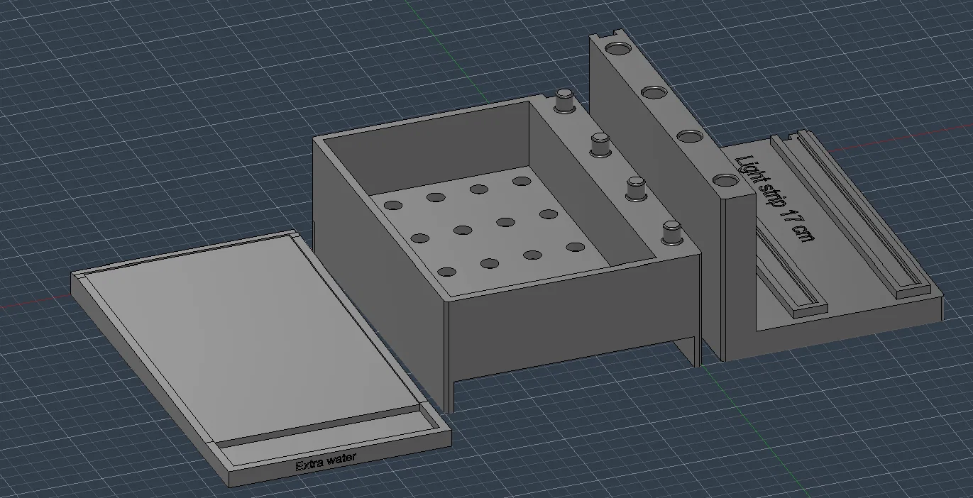 Mình thiết kế khay trồng rau mầm (microgreen) này để giúp việc trồng rau nhanh chóng và hiệu quả hơn. Mình đã bổ sung hệ thống thoát nước để loại bỏ lượng nước dư thừa, đồng thời tích hợp thêm khe gắn dải đèn LED để đảm bảo cây có đủ ánh sáng, cùng với một rãnh đi dây điện tiện lợi.