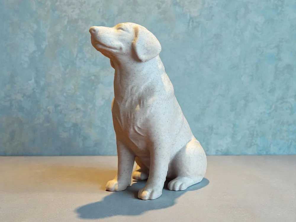 Tư thế ngồi, đôi mắt nhắm nghiền cùng những đường nét điêu khắc mềm mại tạo nên cảm giác tin tưởng và sức mạnh dịu dàng. Thay vì khắc họa chuyển động, thiết kế này tập trung vào sự tĩnh lặng và tính cách, phản ánh đúng bản chất ấm áp, tận tụy và kiên định của giống chó Labrador.