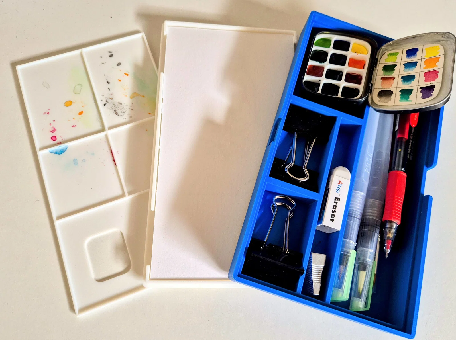 Một chiếc hộp du lịch nhỏ gọn được thiết kế để vẽ tranh màu nước và vẽ ký họa khi đang di chuyển. Sản phẩm gồm ba phần với các mục đích sử dụng khác nhau: