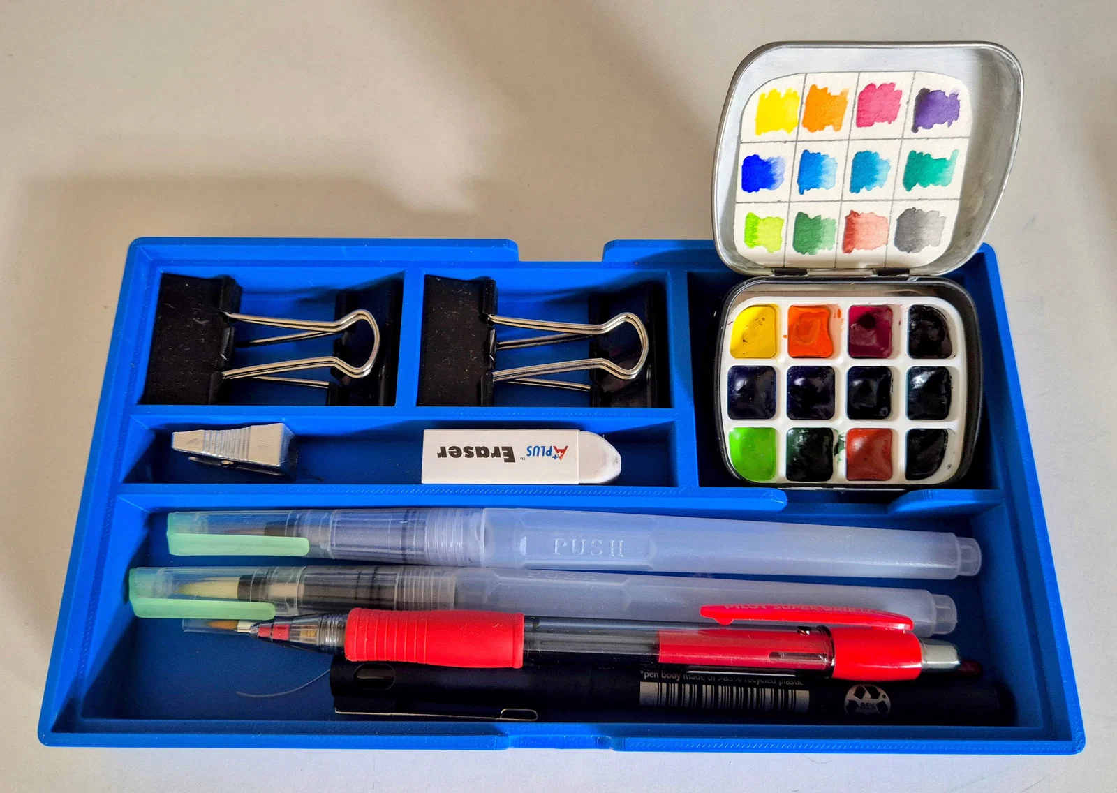 Thân hộp: Các ngăn được thiết kế vừa vặn cho từng món đồ cụ thể: Ngăn lớn nhất để đựng bút và cọ. Ngăn dài dùng để đựng cục tẩy và gọt bút chì. Hai ngăn nhỏ hơn mỗi ngăn chứa được hai kẹp bướm. Ngăn còn lại dành riêng cho một hộp màu nước mini.