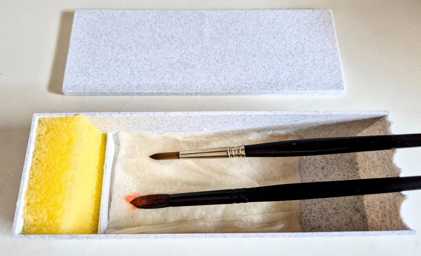 Cách sử dụng tốt nhất: Gấp một chiếc khăn giấy và đặt vào ngăn lớn, sau đó làm ẩm bằng cách thấm nước vừa đủ. Cắt một miếng bọt biển cho vừa vặn, làm ẩm và đặt vào ngăn nhỏ. Giờ đây, bạn có thể đặt cọ vẽ lên phần khăn giấy mỗi khi không cần dùng đến. Nhớ đậy nắp thật kín để giữ độ ẩm cho cọ nhé.