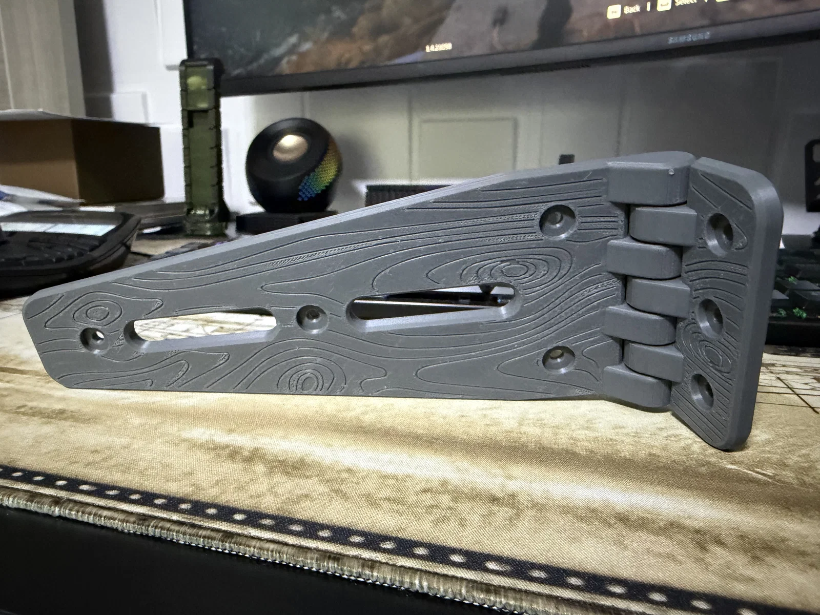 Đặt nằm phẳng trên bàn in và dùng nhựa PETG để in nhé. Mẫu này in nguyên khối (print in place) nên không cần phải lắp ráp gì cả (nhớ đợi mô hình nguội hẳn rồi mới lấy ra khỏi bàn in).