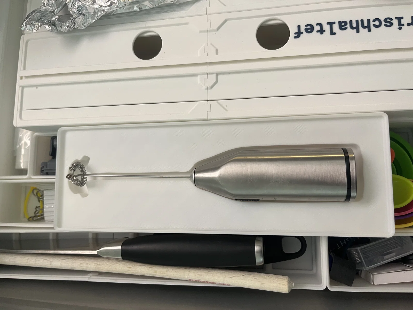 Giữ cho ngăn kéo nhà bếp của bạn gọn gàng với đế Gridfinity được thiết kế riêng để chứa dụng cụ tạo bọt sữa cầm tay (Milchaufschäumer). Giá đỡ này giữ cố định cả phần thân hình trụ và phần que đánh trứng mỏng, giúp mọi thứ ngăn nắp và dễ lấy. Thiết kế này có độ hở nhẹ, nếu bạn cần loại khít hơn thì cứ cho mình biết nhé.