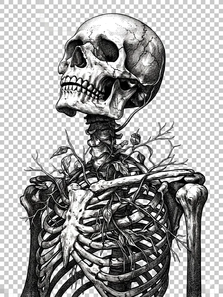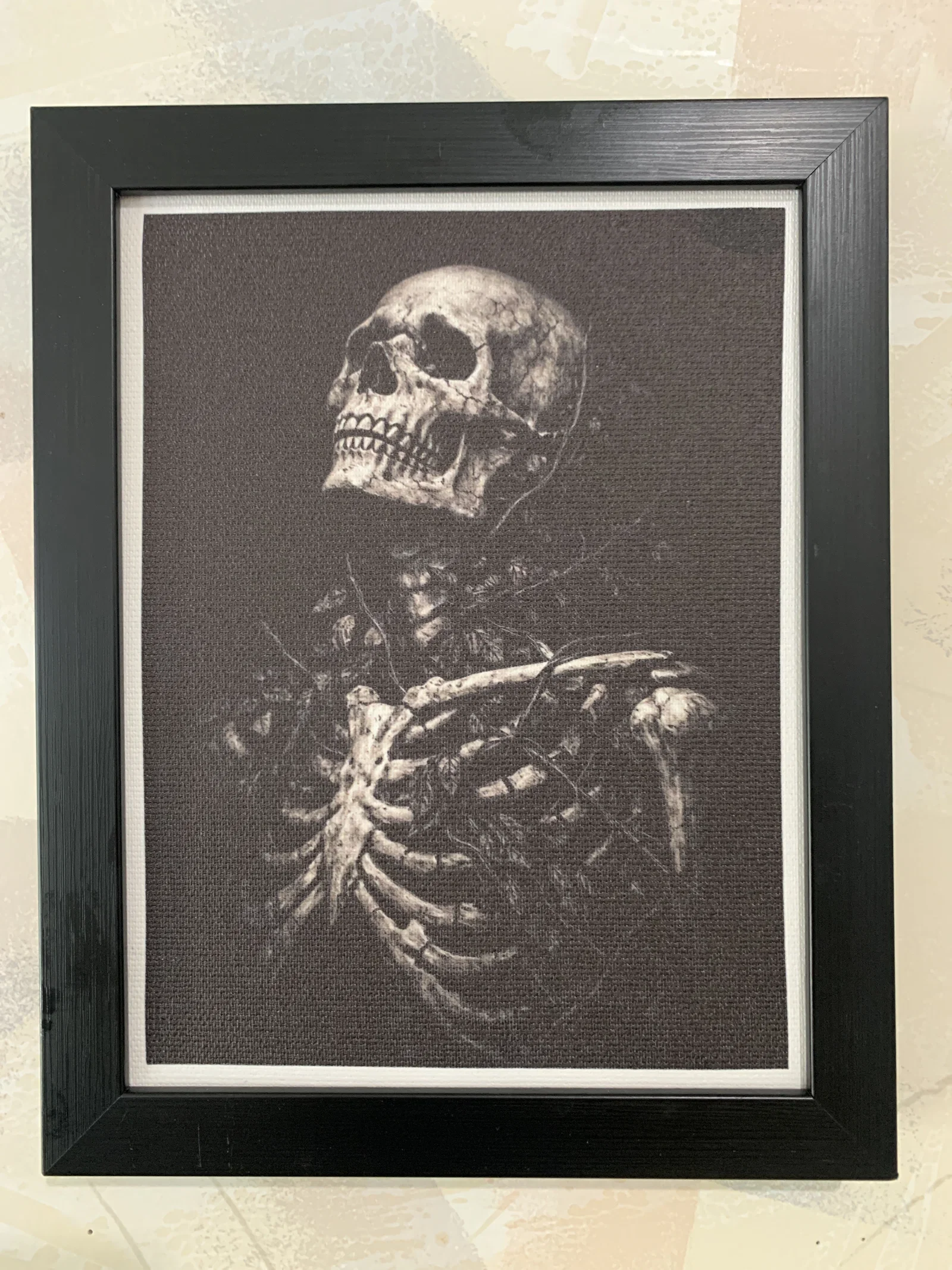Lấy cảm hứng từ một bức tranh được tặng, mình đã tạo ra phiên bản 3D để đặt ngay phía trước bức ảnh gốc. Đây là một tác phẩm điêu khắc mang phong cách gothic độc đáo với hình ảnh bộ xương và đầu lâu đầy ấn tượng.
