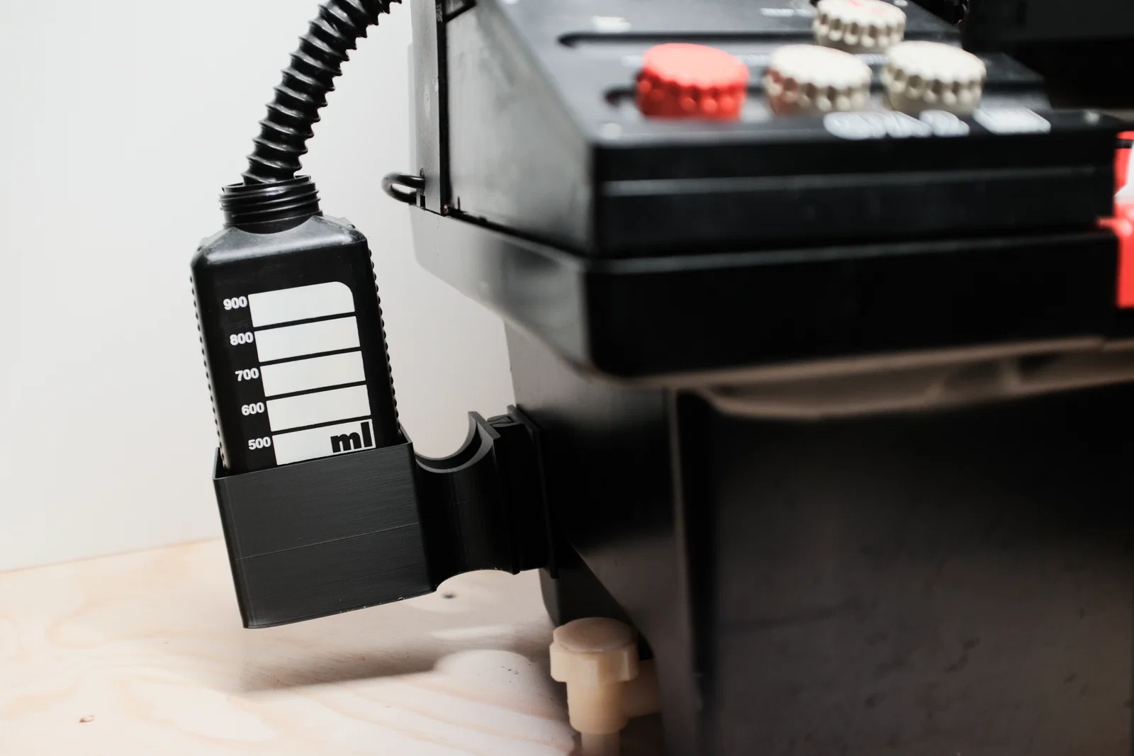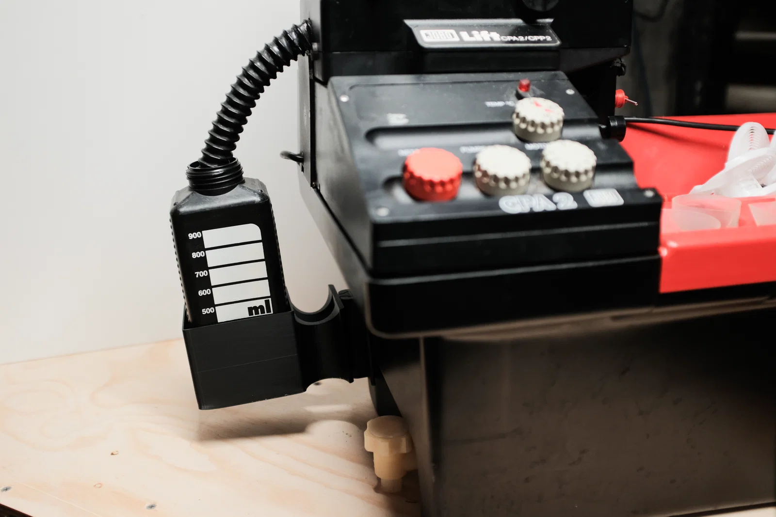 Giữ mấy cái chai của bạn trong lúc chờ xả nước! Thiết kế này cho phép tháo rời giá đỡ để cất gọn nhờ vào phần khớp đuôi én (dovetail), được gắn cố định vào thân máy Jobo bằng băng keo cường lực loại Nano hoặc bất kỳ loại băng keo hai mặt nào mà bạn thấy chắc chắn.