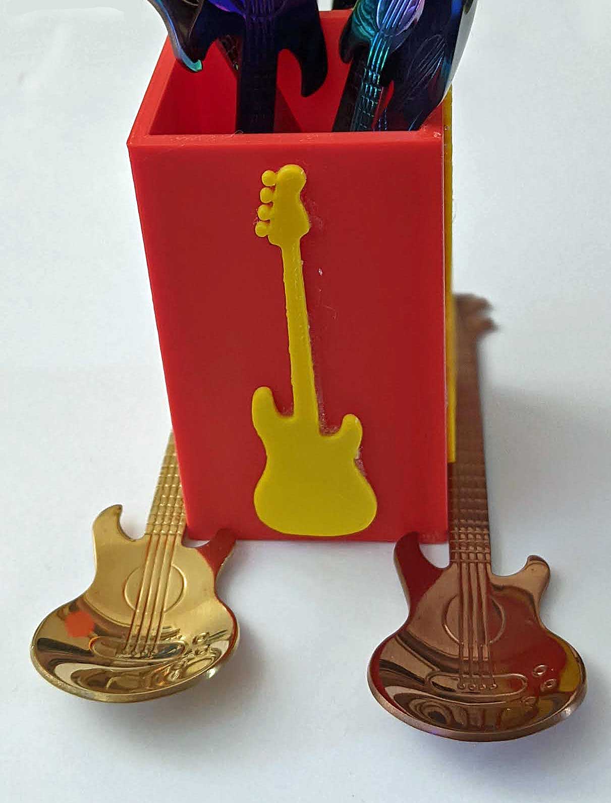 Bạn là một tín đồ của âm nhạc và sở hữu những chiếc muỗng cà phê hình dáng cây guitar đầy cá tính? Vậy thì chắc chắn bạn sẽ không thể bỏ qua mẫu thiết kế này. Đây là một chiếc hộp đựng được in 3D chuyên dụng để làm nổi bật bộ sưu tập muỗng guitar nhỏ nhắn của bạn, thay vì để chúng nằm bừa bãi trong ngăn kéo. Chiếc hộp có thiết kế hình khối đơn giản nhưng lại cực kỳ nổi bật nhờ những họa tiết hình dáng cây guitar được trang trí bên ngoài, tạo nên một sự đồng bộ hoàn hảo cho không gian bàn trà hoặc căn bếp của bạn.