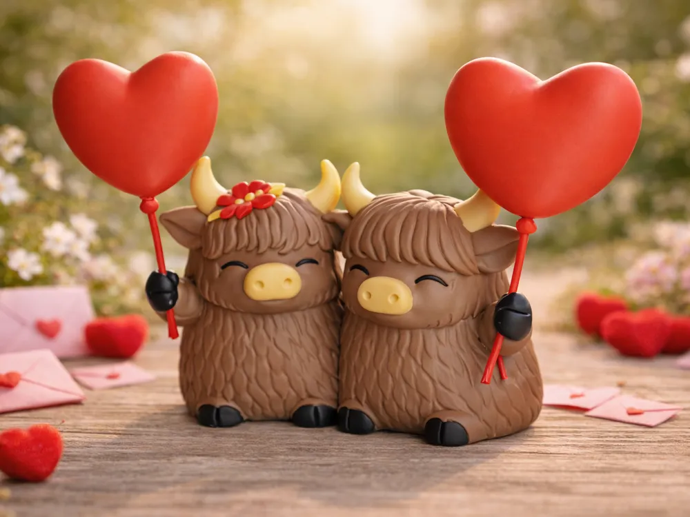 Một cặp bò Highland dễ thương đang cầm bóng bay trái tim, mang lại sự ấm áp cho không gian. Mô hình này rất phù hợp để trang trí hoặc làm quà tặng ngày Valentine, thiết kế tối ưu để in FDM với các đường nét mềm mại và chi tiết tinh tế.