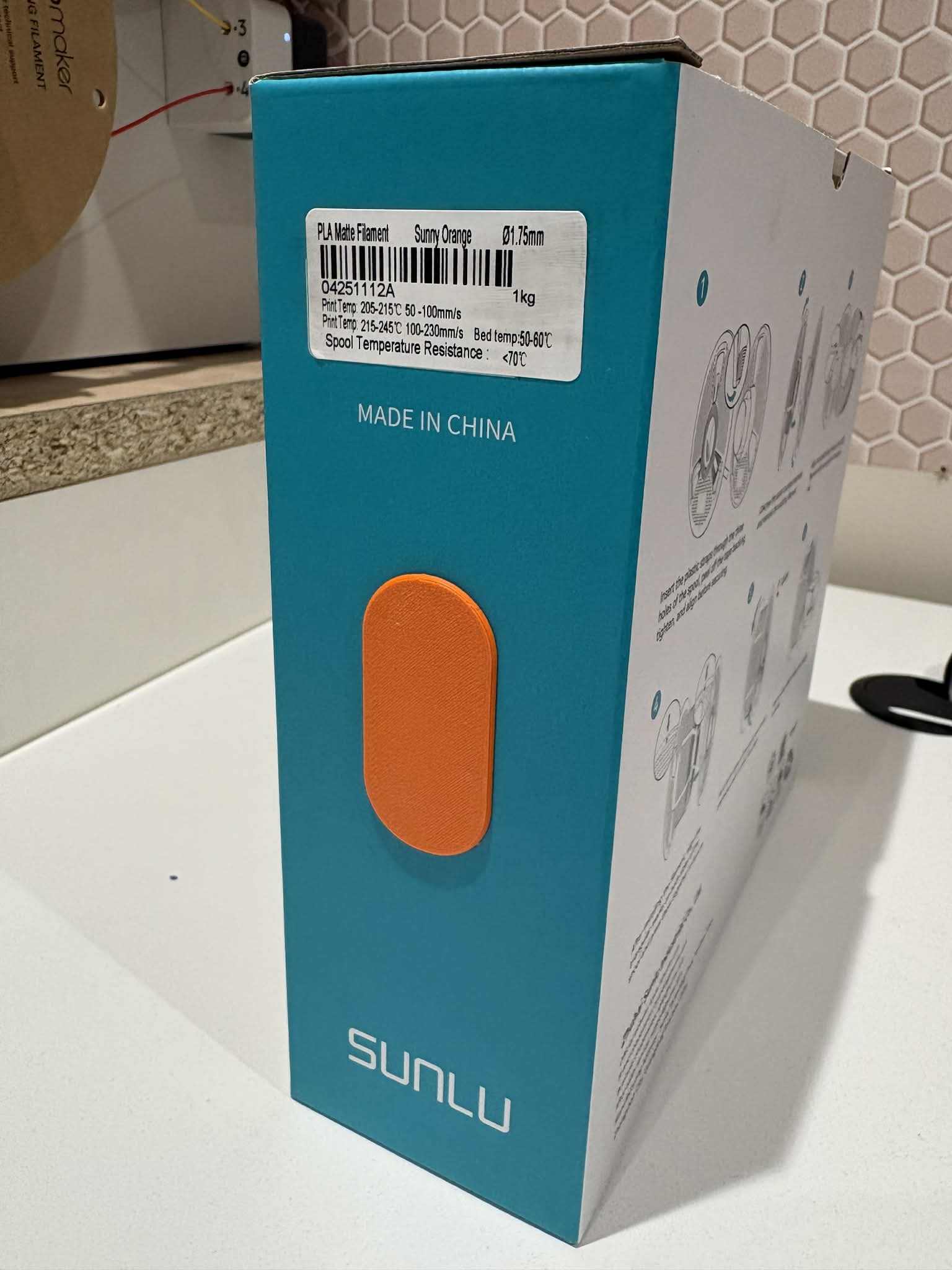 Mẫu in nhỏ gọn giúp bạn nhanh chóng nhận diện loại nhựa in (filament) đang chứa bên trong hộp carton gốc của Sunlu. Thiết kế này được làm để ấn khớp vừa vặn vào lỗ hình oval đã được cắt sẵn ở mặt trước của hộp Sunlu. Thỉnh thoảng, bạn có thể cần kiểm tra bên trong hộp để đảm bảo mẫu đã được gắn chặt, nhưng ngay cả khi không làm vậy thì nó cũng không dễ bị rơi ra ngoài đâu nhé.