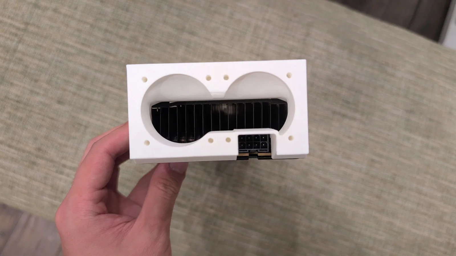 Mình không thể tìm thấy cái fan shroud nào dành riêng cho con CMP100HX-210 cả. Mấy loại cho v100 thì không dùng được cho con này, mặc dù trên mạng người ta nói vậy. Thế nên mình đã tự thiết kế cái này để gắn 2 quạt 40mm bằng ốc M3 bắt trực tiếp vào nhựa. Vì mình lười làm lỗ bắt ốc cho khớp nên mọi người cứ dùng băng dính hai mặt dán ở cạnh GPU và thêm một đoạn băng keo trong dán ở phía trên là được. Đã đính kèm file STEP/CAD cho anh em.