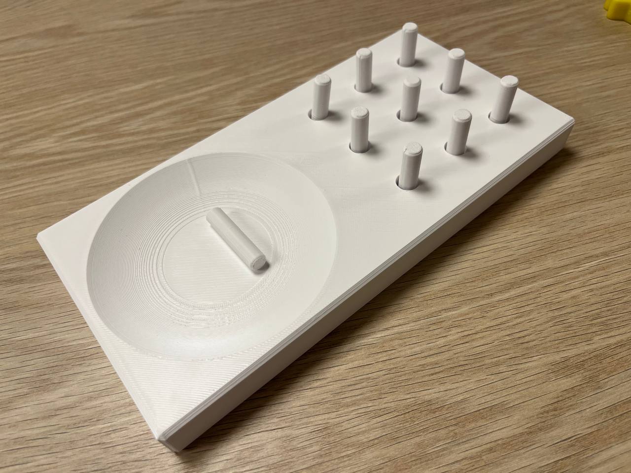 Đây là một bộ mô hình in 3D được thiết kế đặc biệt như một công cụ hỗ trợ giáo dục, giúp trẻ nhỏ rèn luyện các kỹ năng vận động tinh (fine motor skills) một cách hiệu quả và thú vị tại nhà. Thiết kế bao gồm một bảng đế chắc chắn với nhiều lỗ cắm, đi kèm với một khu vực chứa dạng lòng chén để đựng các cọc nhỏ. Hoạt động chính của trẻ là dùng tay lấy từng cọc từ trong lòng chén rồi khéo léo cắm vào các lỗ trên bảng, qua đó giúp đôi bàn tay trở nên linh hoạt và chuẩn xác hơn.