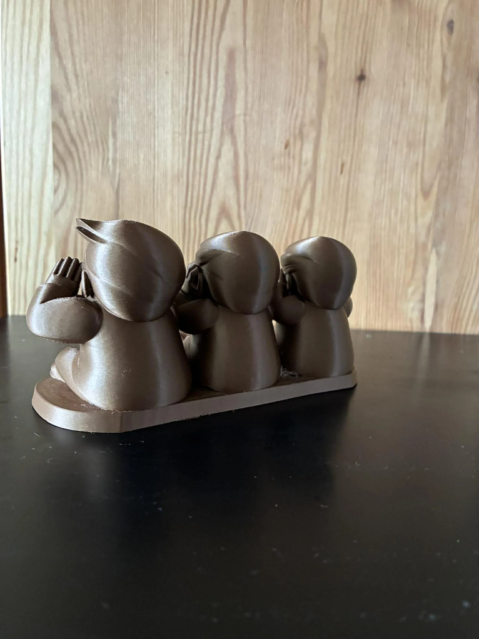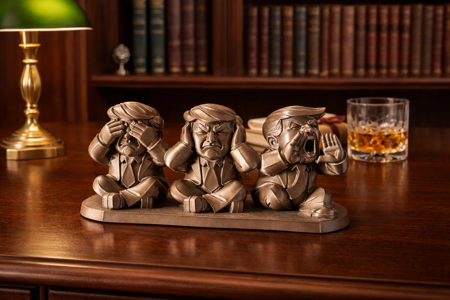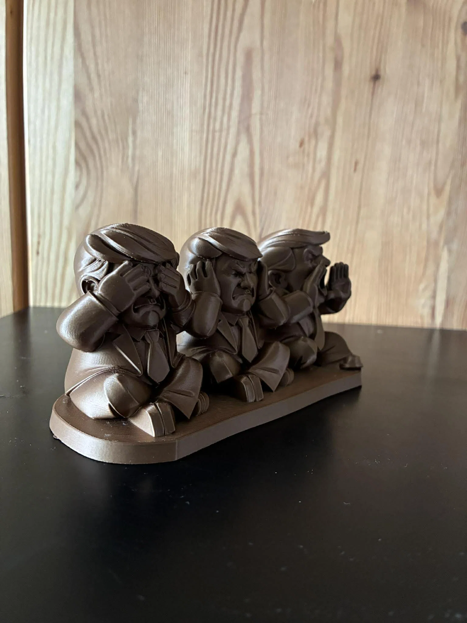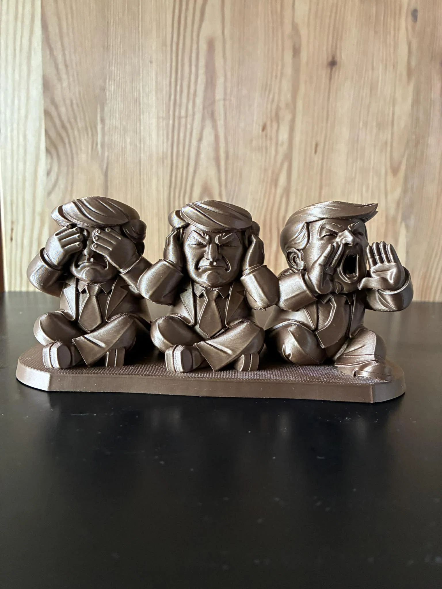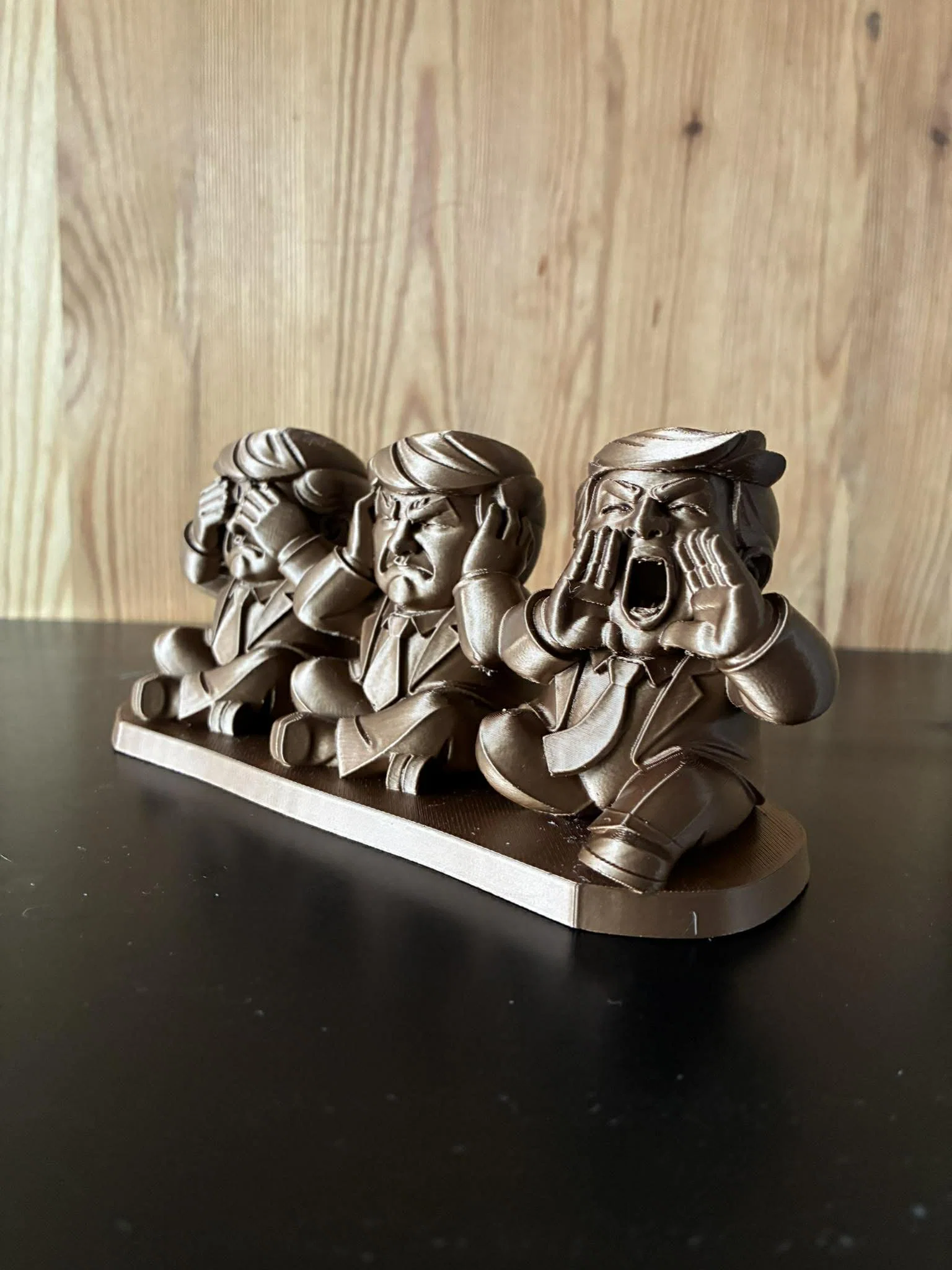 Đây là bộ ba chú khỉ thông thái… phiên bản đã được nâng cấp. Con thứ nhất không thấy gì. Con thứ hai không nghe gì. Và con thứ ba… chẳng hiểu mô tê gì cả, nhưng vẫn sẽ giải thích cho bạn nghe tại sao nó đúng. Rất to. Rất, rất to. Chẳng ai biết nó đang nói cái gì, nhưng có một điều chắc chắn là: 👉 nó cực kỳ tự tin vào những gì mình nói. Một tác phẩm tóm tắt hoàn hảo các cuộc tranh luận hiện đại: chẳng ai lắng nghe, chẳng ai nhìn nhận… nhưng tất cả vẫn cứ tranh cãi. Mục tiêu cũng đơn giản thôi: 👉 làm bạn mỉm cười… hoặc cười nghiêng ngả. Rất hợp để trưng trên bàn làm việc, xưởng, hoặc đơn giản là để nhắc nhở rằng dù mình có sai… thì vẫn cứ có thể nói to lên.