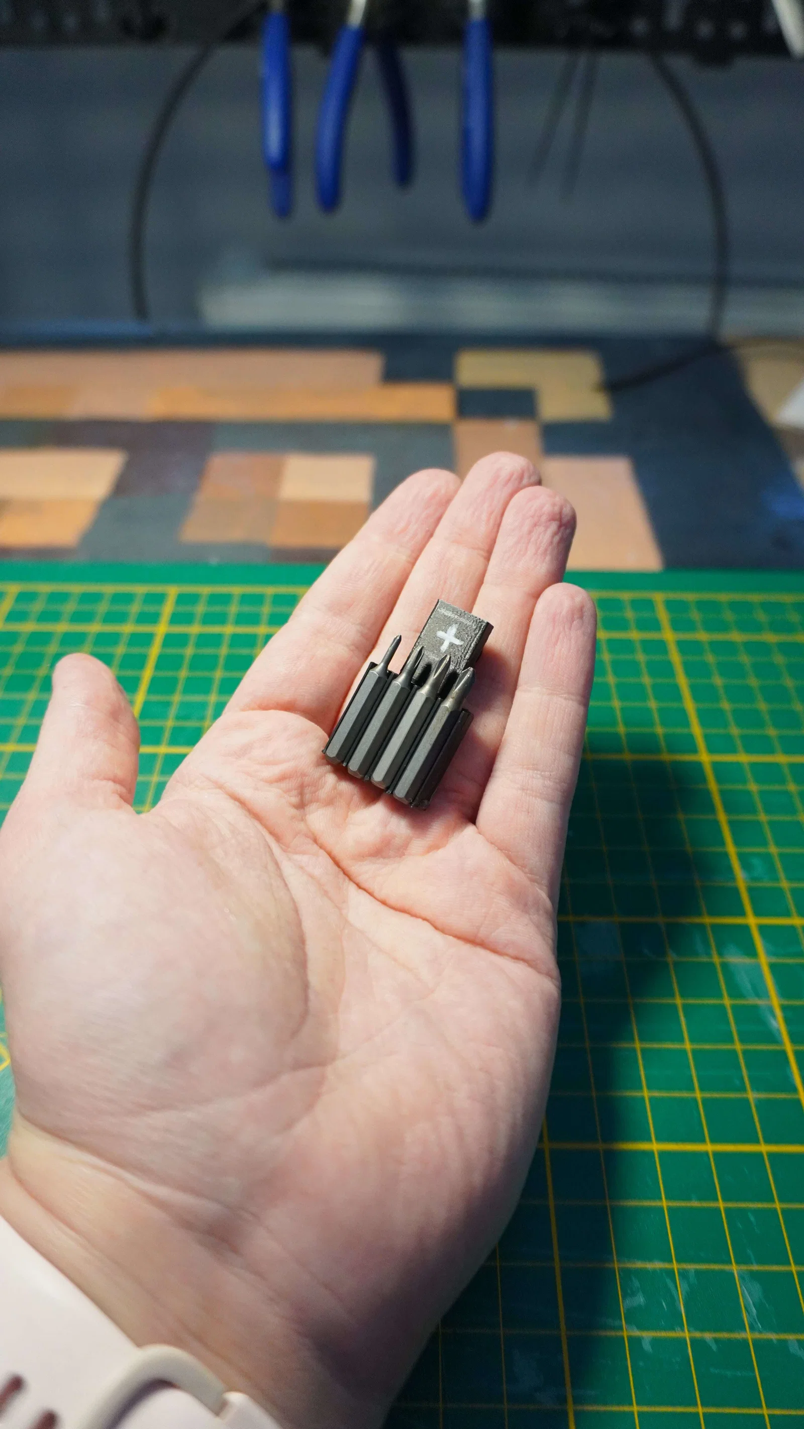 Cái giá đỡ mũi vít này được thiết kế chuyên dụng cho máy vặn vít cầm tay và máy khoan, đi kèm với phần ngàm để gắn lên bảng treo dụng cụ (pegboard). Sản phẩm có thiết kế khe hở để bạn gắn thêm nam châm nhỏ giúp giữ chặt mũi vít, đồng thời có thể dễ dàng thay đổi kích thước để phù hợp với mọi cỡ mũi vít khác nhau.
