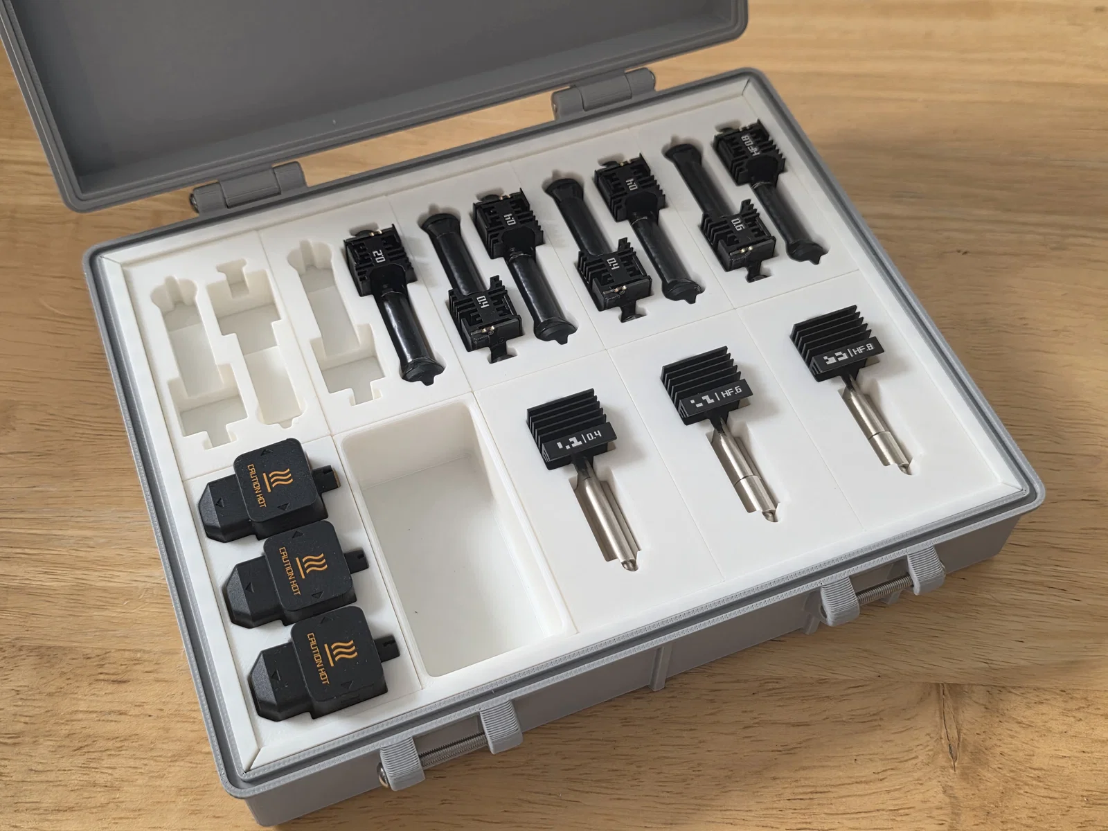 Hệ thống hộp đựng hotend dạng mô-đun, có thể tùy chỉnh linh hoạt với các miếng chèn dạng gài khớp chắc chắn. Tương thích với các dòng hotend như Bambu H2/P2 và nhiều loại khác.