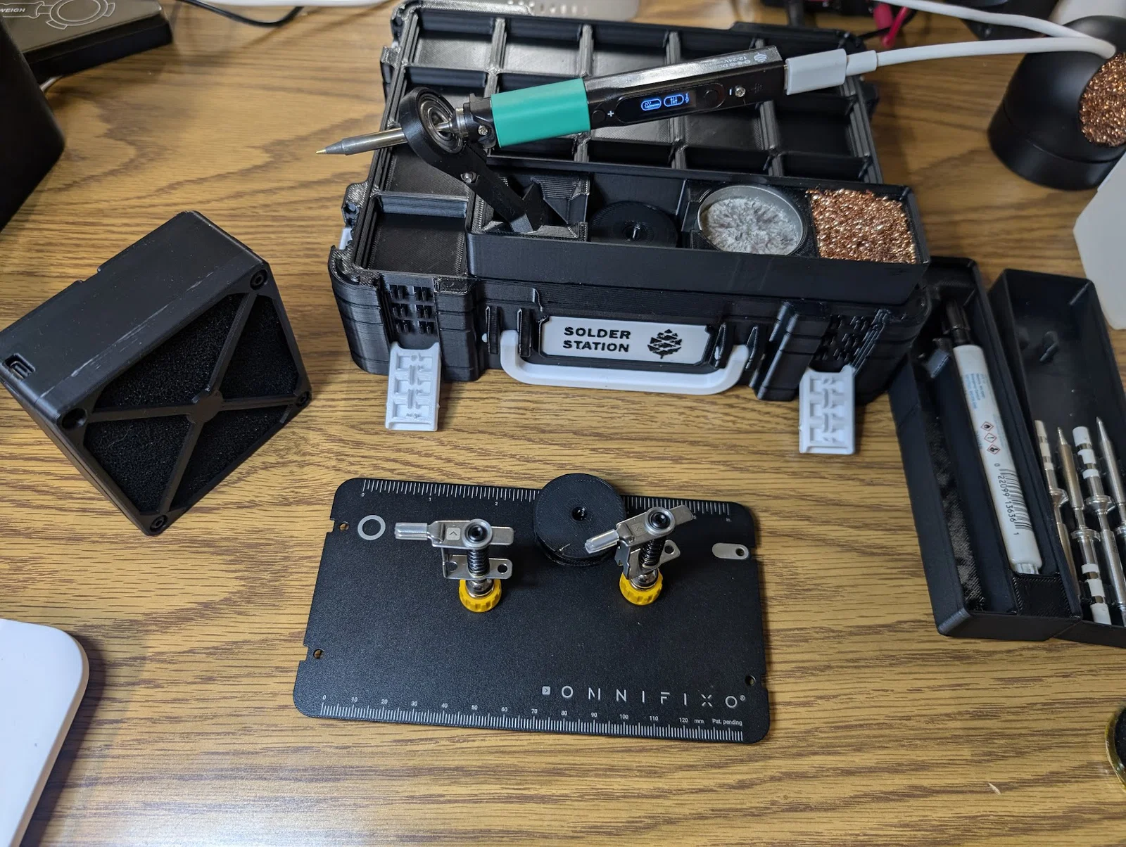 Vì hay phải mang mỏ hàn đi làm việc xa, mình quyết định tự làm một bộ đồ nghề di động cho gọn. Hầu hết các món mình in ở độ phân giải 0.28mm (trừ cái hộp hút khói).