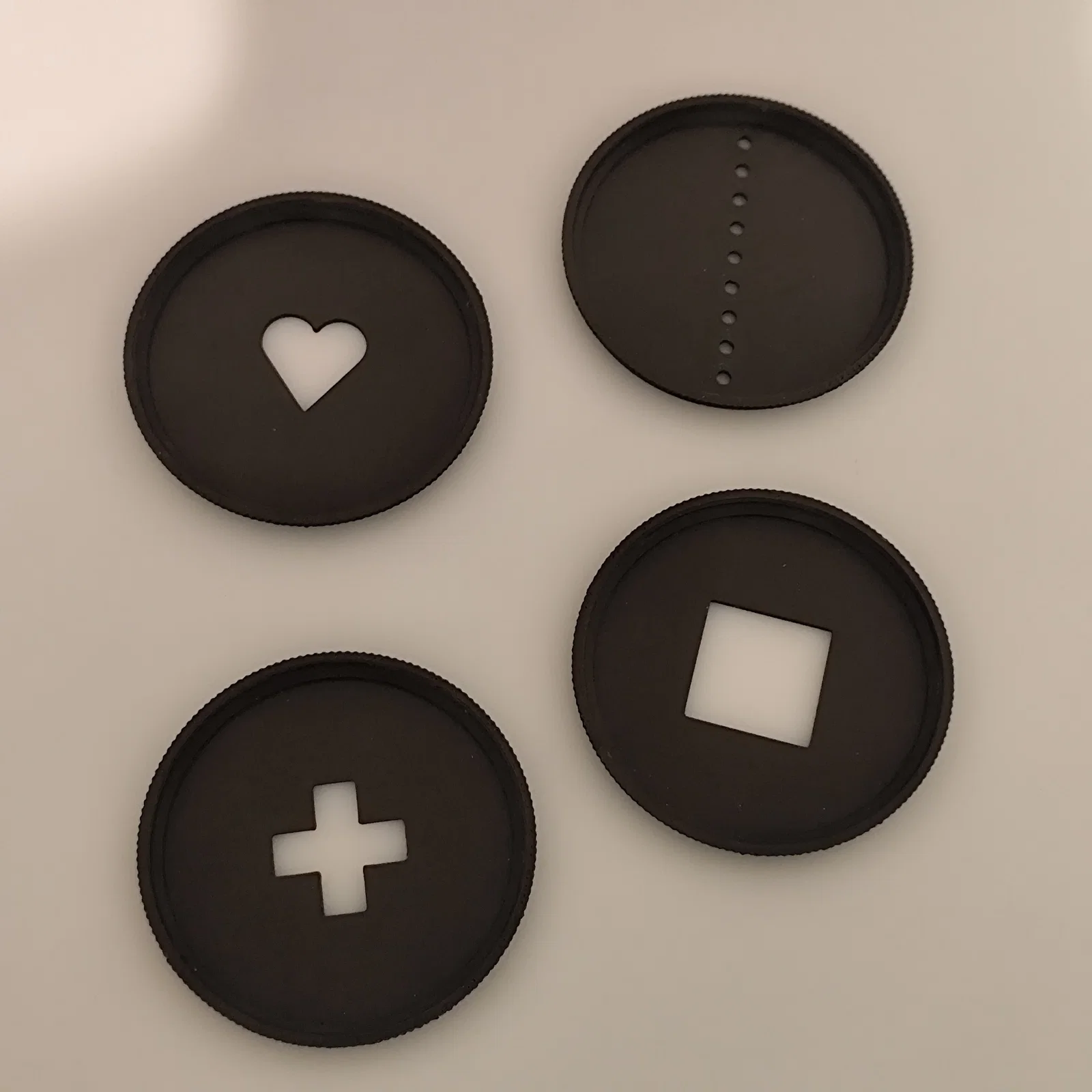Bộ sưu tập gồm 4 mẫu filter bokeh cho ống kính 62mm bao gồm hình trái tim, hình vuông, dấu cộng và hàng lỗ nhỏ. Các filter có ren trong và ngoài tiện lợi cho việc chồng lớp, dễ dàng in với thông số 0.1mm layer height và không cần support.