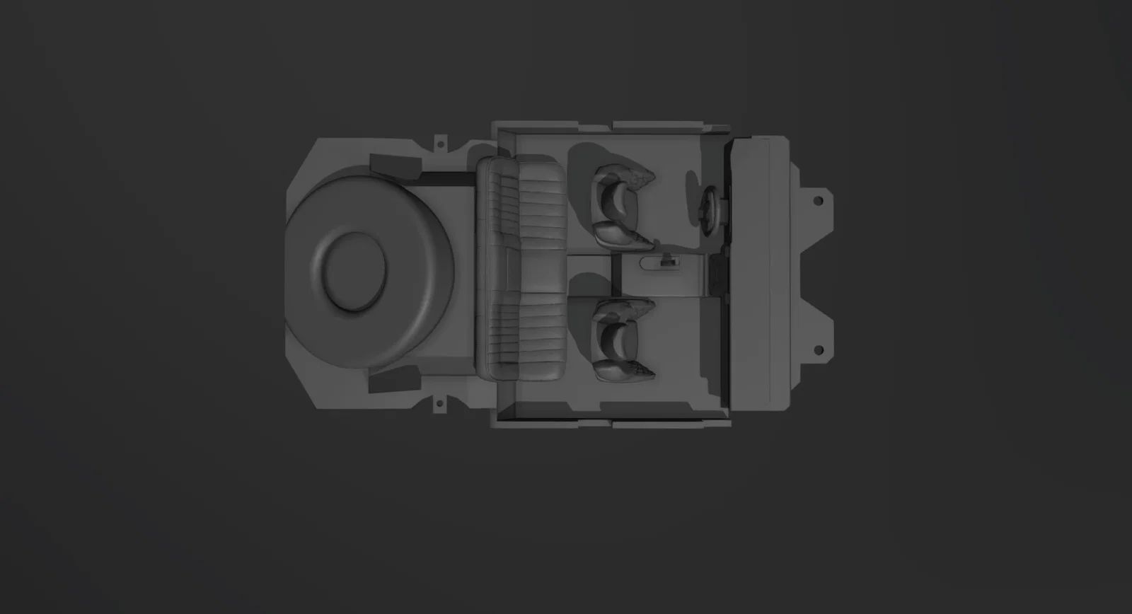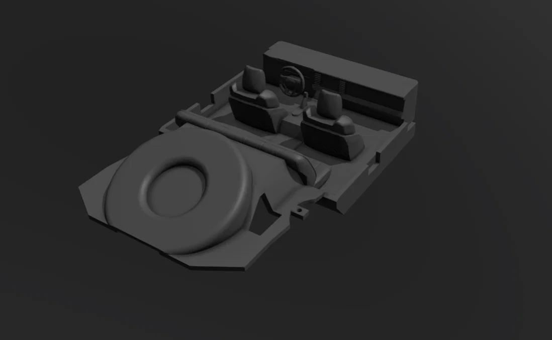 • Chi tiết mô phỏng: Bộ kit bao gồm ghế lái, ghế phụ, bảng táp-lô và không gian sàn phía sau với vị trí đặt bánh dự phòng rất đặc trưng.