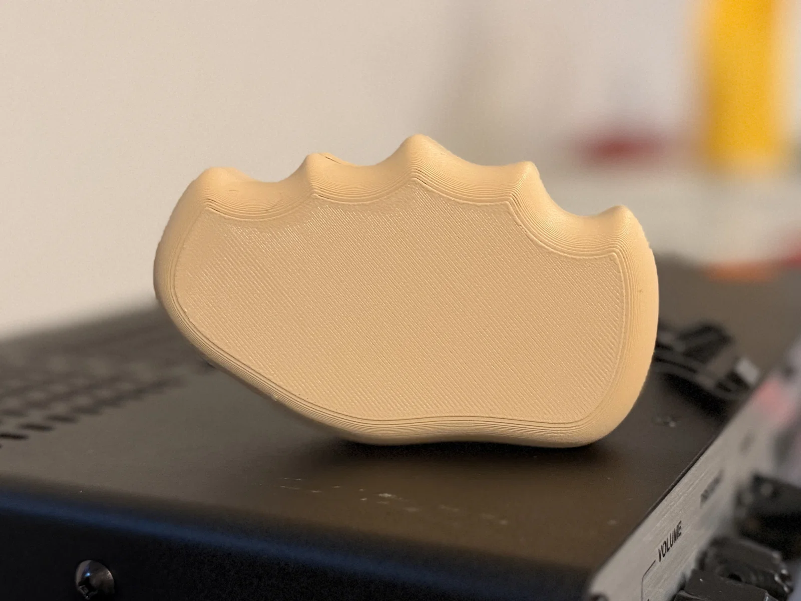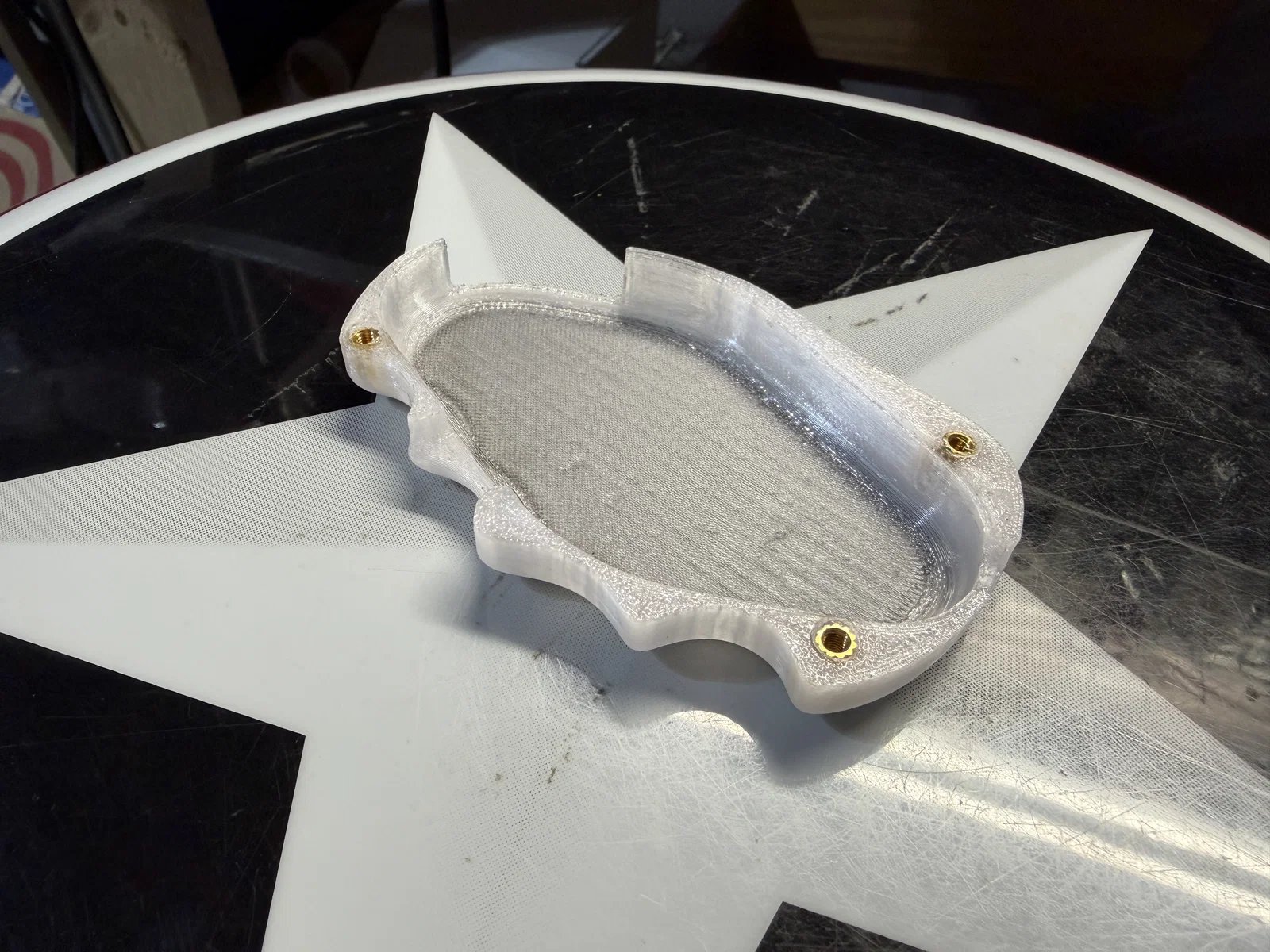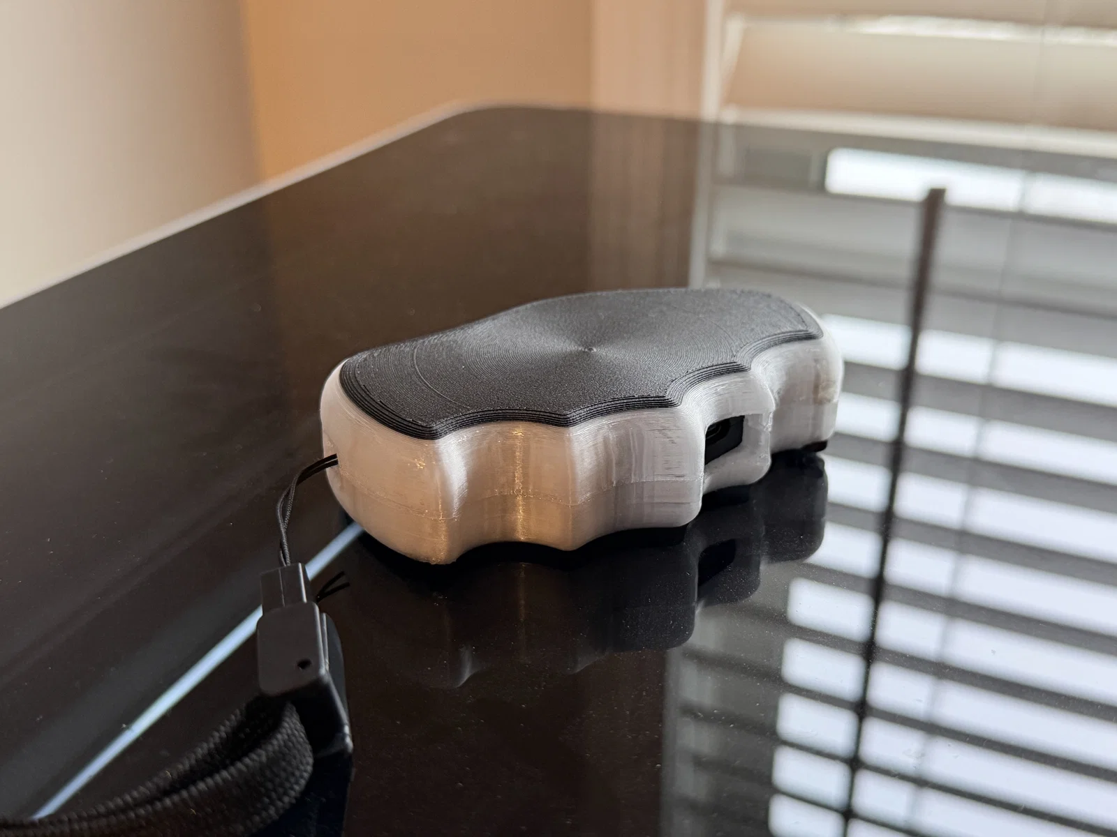Mình đã thử in với mặt phẳng (mặt ngoài) áp xuống bàn in nhưng kết quả không được ưng ý lắm, phần bo cong lớn nhìn khá xấu. Cách in cho kết quả tốt nhất là để mặt ngoài hướng lên trên và sử dụng support đầy đủ ở phía dưới (trừ 3 lỗ ốc ở nửa dưới của vỏ). Cách này tốn nhựa hơn một chút nhưng bề mặt hoàn thiện bên ngoài đẹp hơn hẳn. Để đạt kết quả tốt nhất, mình dùng loại nhựa khác (PETG/PLA) làm lớp tiếp giáp support với khoảng cách Z bằng 0, giúp bề mặt hỗ trợ cực kỳ mịn.
