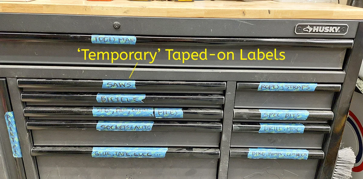 Các ngăn kéo này thường không có nhãn dán để giúp phân biệt đồ đạc bên trong. Tôi đã mua một chiếc bàn làm việc Husky từ năm 2018 và phải dùng băng keo giấy dán lên tay cầm để ghi chú tạm thời. Sau khoảng 7 năm rưỡi sử dụng, cuối cùng tôi cũng đã quyết định tự tay thiết kế những chiếc bảng tên chuyên nghiệp hơn.