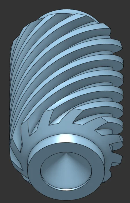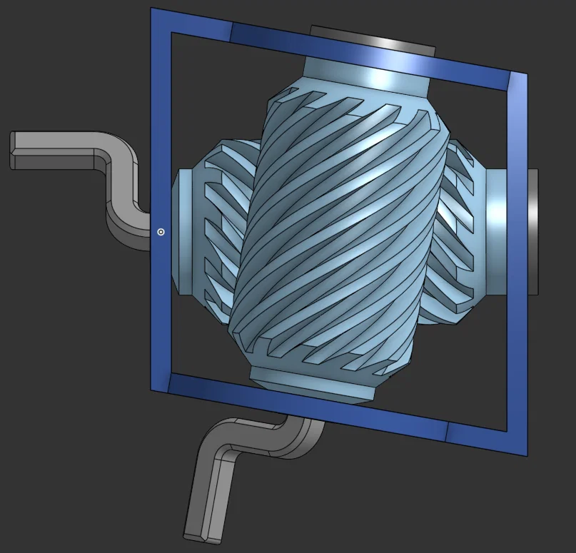 Mô hình này là một bộ bánh răng trục vít (gần như) vuông góc. Các răng khớp với nhau để khi bạn xoay bánh này, bánh kia cũng sẽ xoay theo.