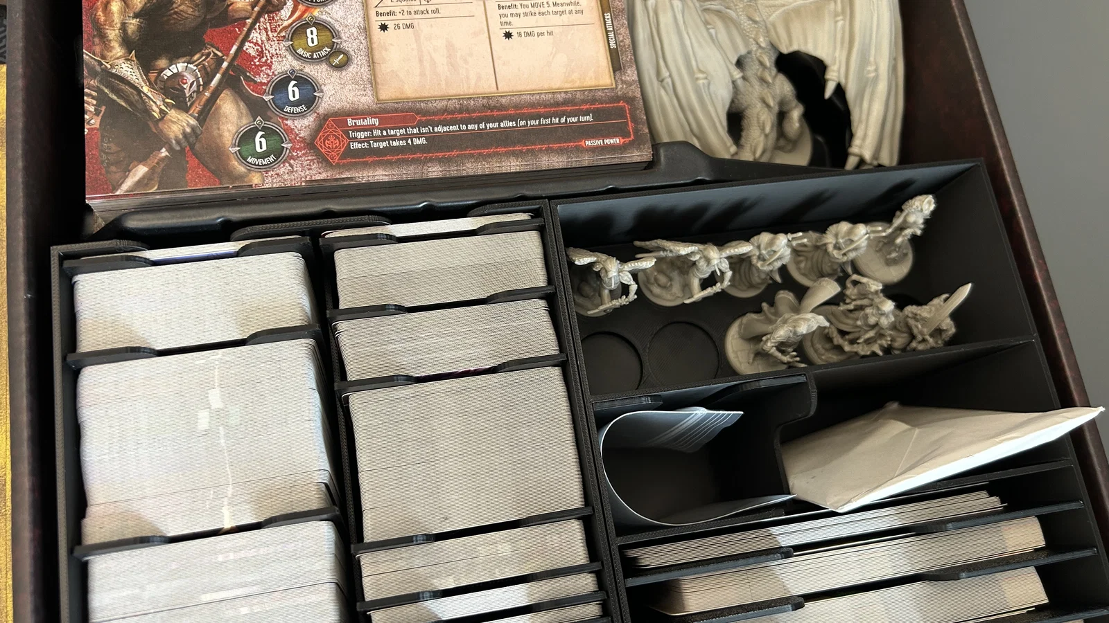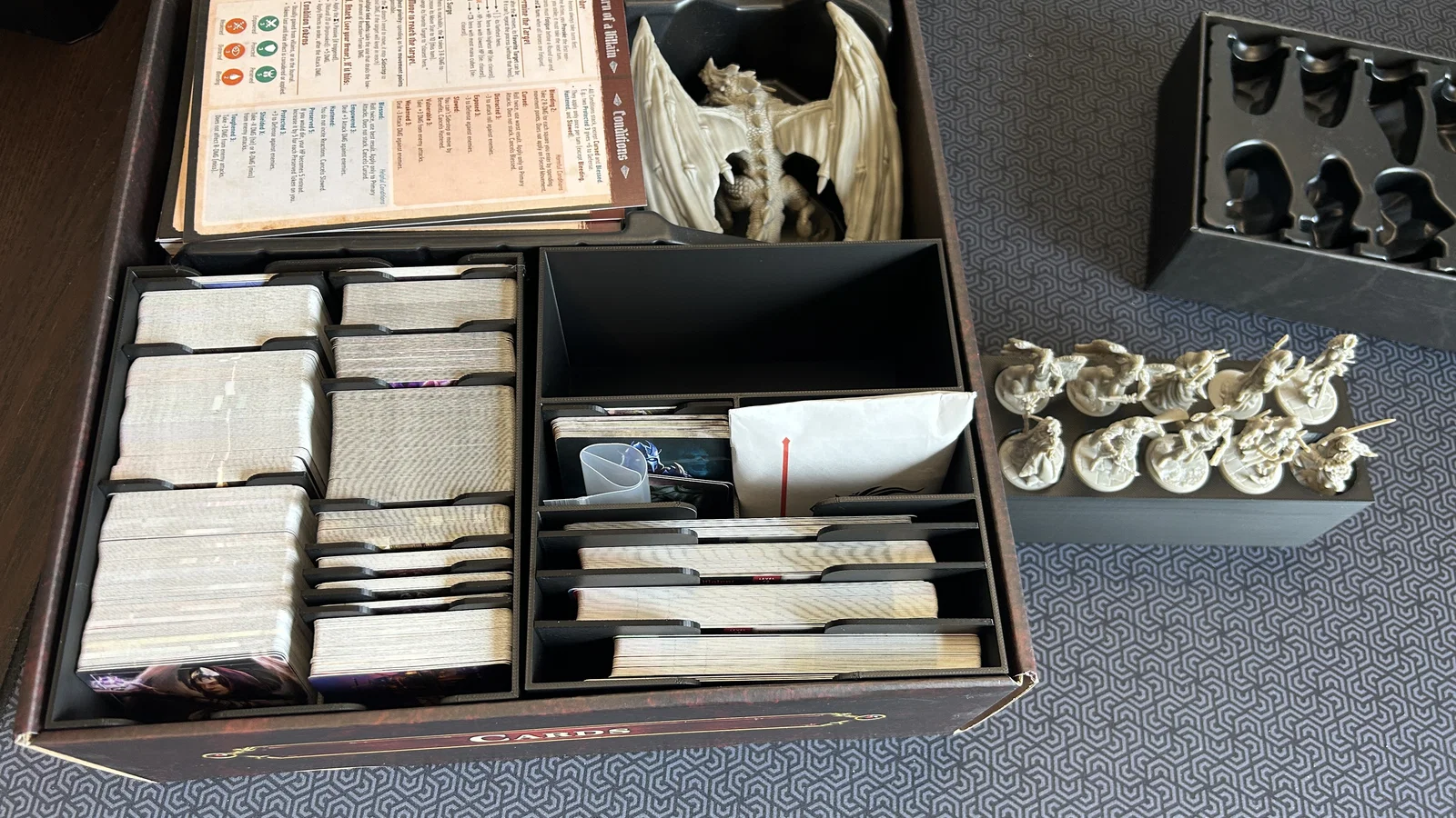 Đây là mẫu khay đựng bài dành cho phiên bản hộp lớn của trò chơi Ultimate Tanares Adventures. Mẫu thiết kế này dùng để thay thế phần khay giấy mặc định đi kèm trong hộp, đồng thời có thêm không gian để cất giữ 10 mô hình nhân vật từ gói stretch goal. Khay thứ nhất dùng để chứa tất cả các loại thẻ bài kích thước tiêu chuẩn. Khay thứ hai dùng để chứa các thẻ bài trùm (boss/villain) khổ lớn, có một ngăn riêng để bạn lưu trữ các thẻ bài đang dùng dở (giữa các phiên chơi), một khe cắm cho phong bì bí mật và không gian cho các mô hình nhân vật stretch goal. * Bộ sản phẩm đi kèm với nhiều vách ngăn để phân loại các loại thẻ bài khác nhau, giúp việc tìm kiếm dễ dàng hơn. Các vách ngăn được thiết kế khít một cách có chủ đích, giúp các thẻ bài còn lại không bị trượt đổ khi bạn rút một vài thẻ ra sử dụng.