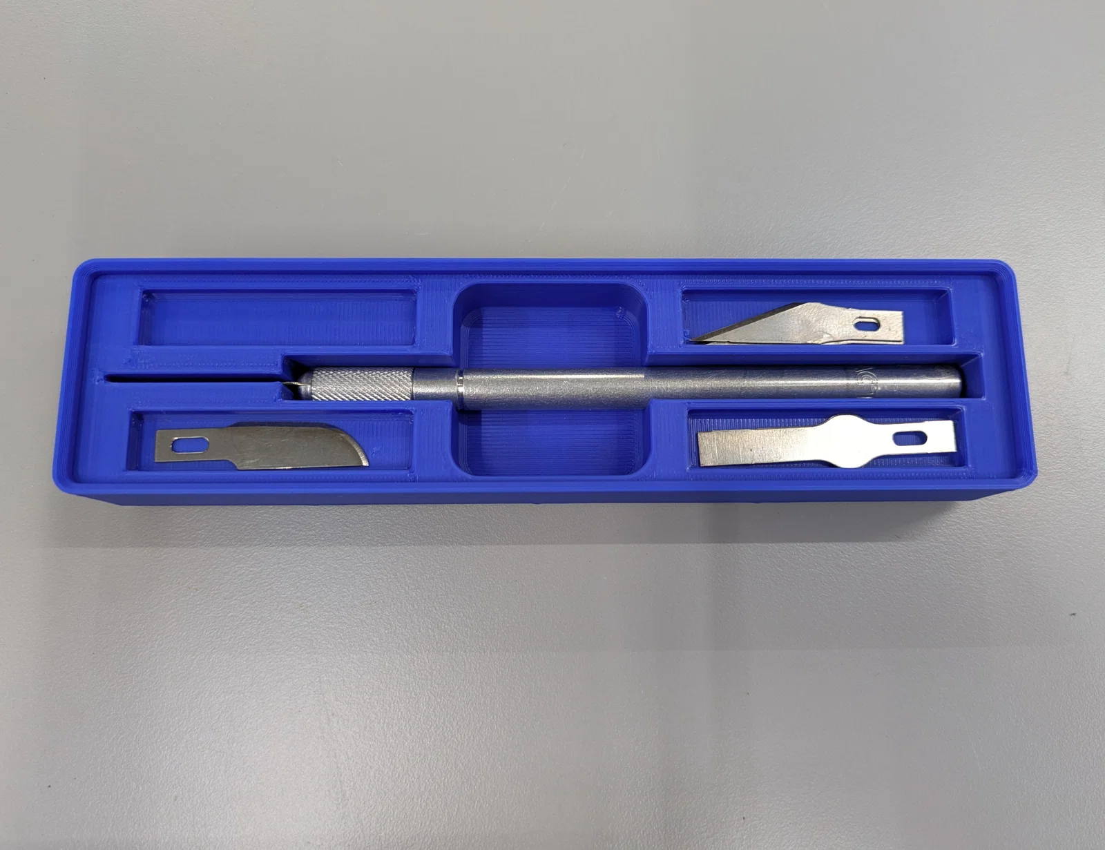 Mình dựa trên mẫu dao X-Acto 5211 với đường kính thân 8mm và một ít lưỡi thay thế. Bạn sẽ cần dùng kìm mũi nhọn để lấy lưỡi dao dự phòng ra khỏi khe chứa — theo mình thì như vậy sẽ an toàn hơn.