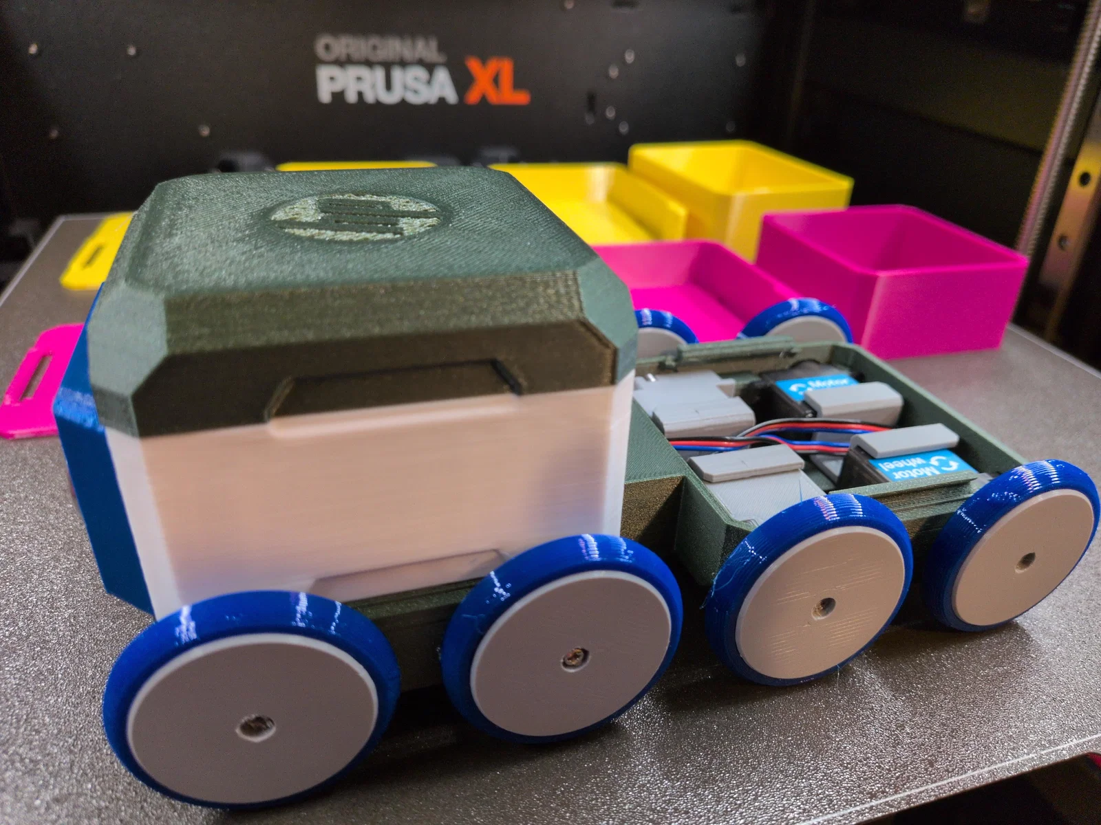 Giới thiệu khung gầm xe tải HP Otto phiên bản mở rộng (Extended Frame). Trong các file tải về, mình đã bao gồm nhiều biến thể thùng xe bán tải dành cho HP Otto. Có đủ các kích thước nhỏ, vừa và lớn với tùy chọn thành thùng cao hoặc thấp. Đặc biệt nhất là phiên bản thùng xe có bửng sau (tailgate) hoạt động được! Khung gầm này nâng cấp hệ thống vận chuyển từ 2 bánh và thanh trượt của bản gốc lên thành 8 bánh! Vì bánh xe zin quá to không lắp vừa vào một module đáy Otto, mình đã thiết kế một bộ bánh và lốp tùy chỉnh đi kèm trong file. Khung gầm mở rộng có sẵn đường đi dây để bạn lắp thêm motor hoặc servo ở phần sau. Mọi linh kiện lắp vừa module đáy Otto tiêu chuẩn đều tương thích với phần sau này. Các khớp nối ở phần sau sử dụng ngàm tiêu chuẩn của Otto nên bạn thoải mái kết nối các linh kiện cái (female) vào. Đây không chỉ là một chiếc xe bán tải mà là một hệ thống tùy biến không giới hạn. Mình có cung cấp file STEP cho các tấm phẳng nhỏ và vừa để anh em dễ dàng remix thêm nhiều kiểu xe khác nhau. ### Hướng dẫn Vòng bi: Link Amazon In một phần ExtendedFrame. Đối với mỗi bánh xe không gắn motor, hãy in bằng nhựa PLA (trừ khi có chỉ định khác): BlankServor (hoặc BlankServo-WheelSensorCutout) BearingCenterAxle WheelSmall TireSmall - TPU #### Lắp ráp Lắp trục qua vòng bi. Nhấn cụm này vào phần BlankServo sao cho trục nhô ra ngoài. Phần BlankServo kèm vòng bi và trục này có thể lắp vào bất kỳ vị trí nào gắn được servo. Dùng ngàm kẹp zin của Otto để cố định các BlankServo. Lắp lốp TPU vào từng bánh xe. Gắn bánh xe vào trục bằng ốc servo. ##### Lưu ý Khi in BlankServo, hãy để phần có khía hướng xuống bàn in. Bánh xe có một ống trụ ở tâm, khi in hãy để hướng lên trên. Bánh xe tương thích với motor Otto tiêu chuẩn. Nếu in các file STEP motorcross và dùng kèm với bánh xe zin, bạn có thể dùng bánh zin với Bearing Center Axle từ dự án này.