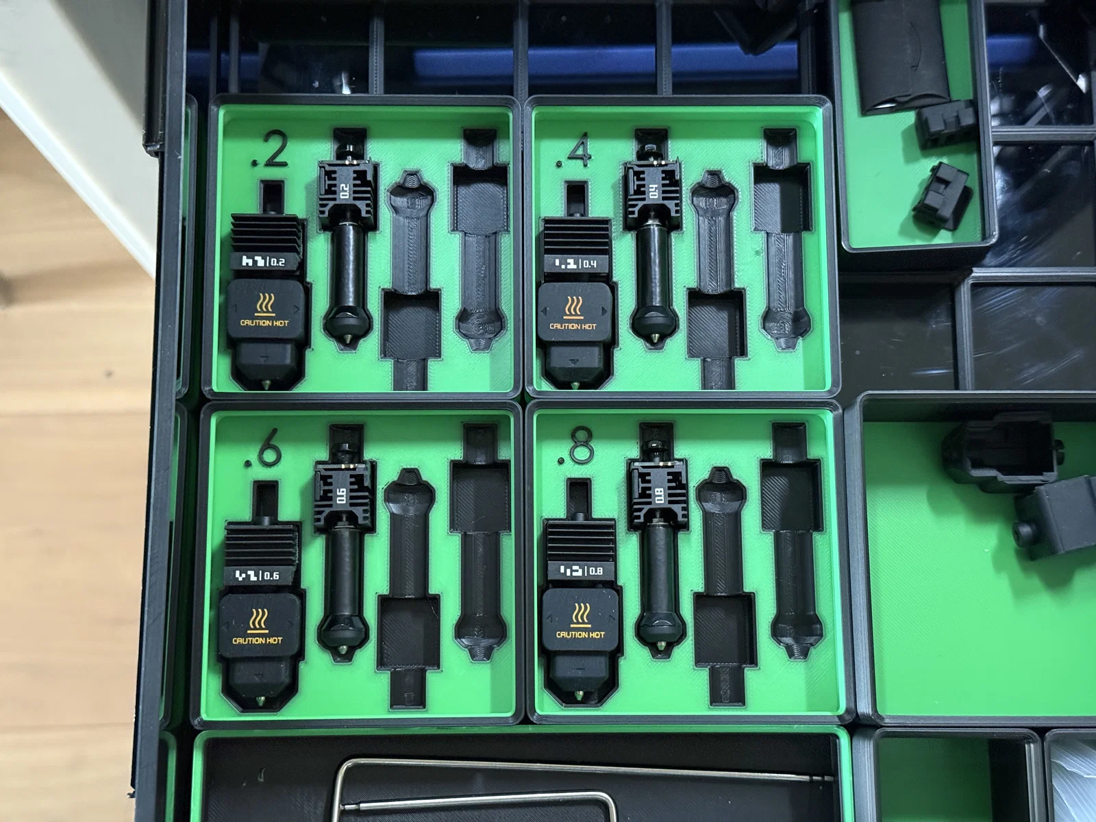 Bạn đang đau đầu vì các vòi phun H2C để lung tung khó tìm kiếm? Hãy thử ngay giải pháp khay lưu trữ theo chuẩn Gridfinity dành riêng cho H2C. Với thiết kế thông minh, các ngăn đựng được định hình vừa khít giúp bảo vệ vòi phun của bạn một cách an toàn nhất. Sản phẩm giúp phân loại vòi phun theo các kích thước từ 0.2 đến 0.8 một cách khoa học, giúp bàn làm việc của bạn trở nên gọn gàng, hiện đại và chuyên nghiệp hơn. Đây là phụ kiện không thể thiếu cho những ai muốn tối ưu hóa không gian lưu trữ linh kiện máy in 3D của mình một cách hiệu quả và bền bỉ nhất.