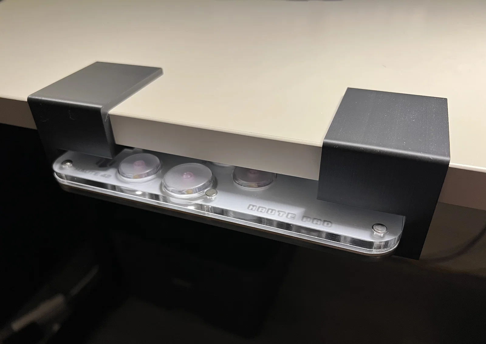 Giá đỡ lưu trữ dưới gầm bàn dành riêng cho các dòng tay cầm leverless Haute42 S series. Thiết kế kèm file SCAD cho phép tùy chỉnh kẹp theo độ dày mặt bàn, giúp bạn sắp xếp không gian chơi game gọn gàng và thẩm mỹ hơn.