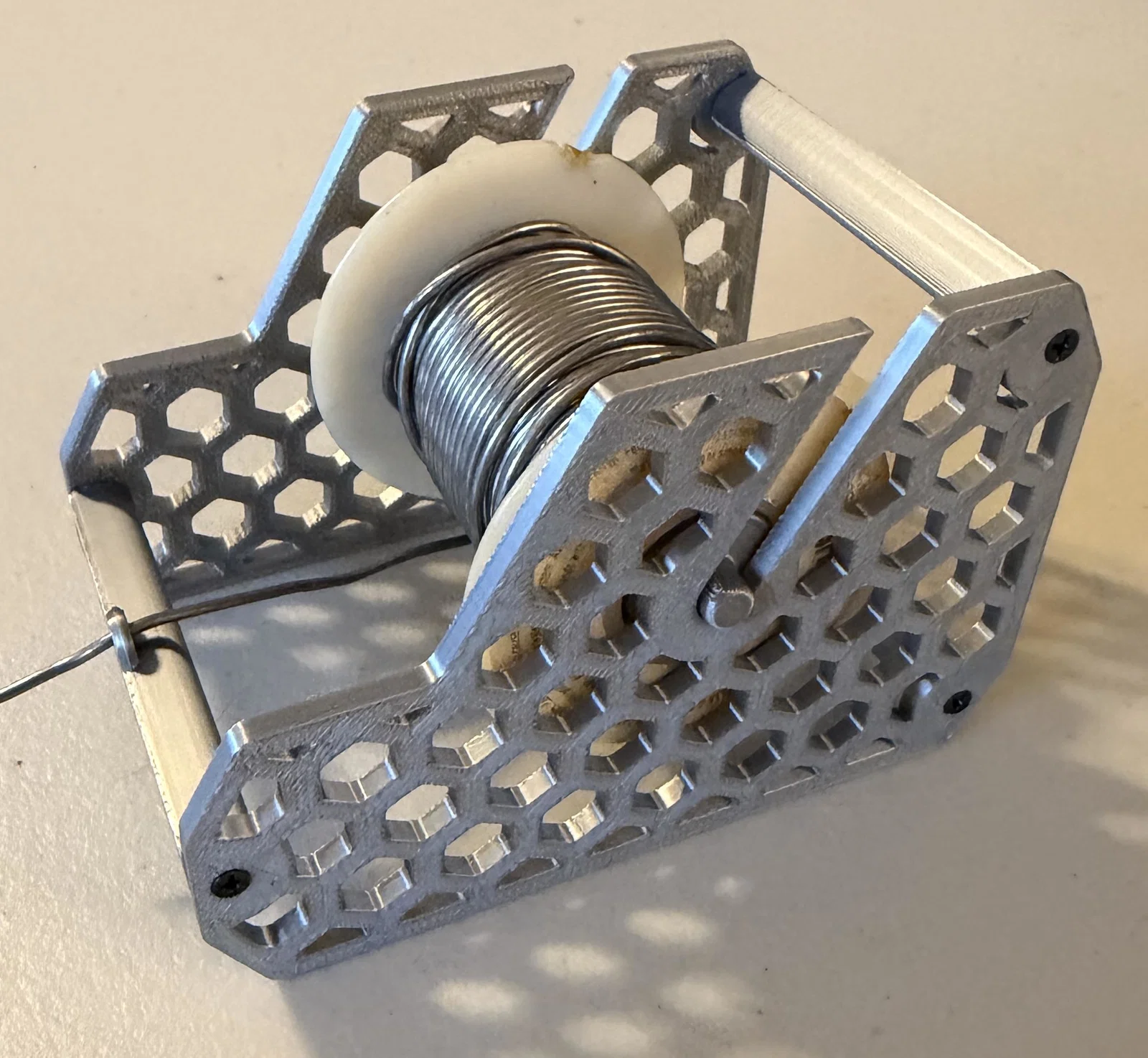 Giá đỡ chì hàn được thiết kế lại để vừa với các cuộn chì lớn (63mm x 74mm). Sản phẩm hỗ trợ nhiều loại ốc vít và có thể tùy chỉnh vị trí thanh chặn cho phù hợp với nhu cầu thay cuộn chì của bạn.