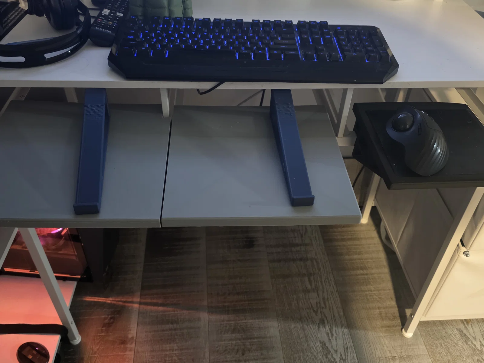 Mình mới mua một cái bàn vừa vặn với không gian phòng, nhưng rồi nhận ra là không đủ chỗ để đặt bàn phím và lót chuột. Sau khi tháo bỏ ngăn kéo vải, phần khung bàn là thanh vuông kích thước khoảng 21mm. Nếu bạn cũng đang dùng loại bàn này (mình mua trên Amazon), thì thiết kế này sẽ rất phù hợp với bạn. Như trong hình, mình đã in 2 khay lớn cho bàn phím và một khay nhỏ riêng biệt cho chuột.