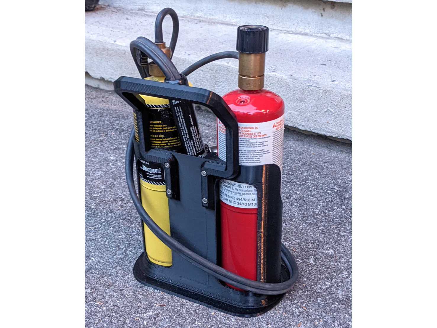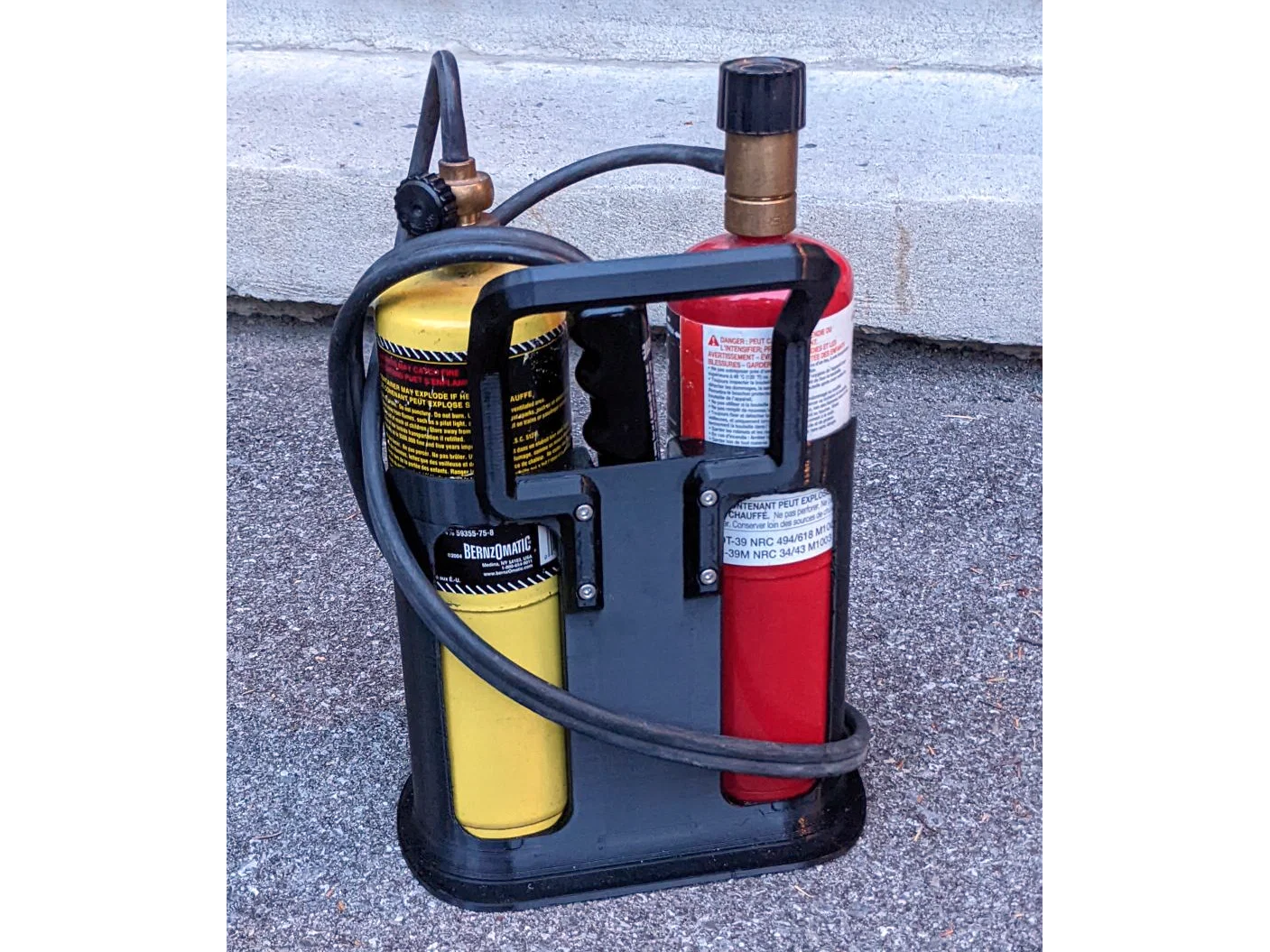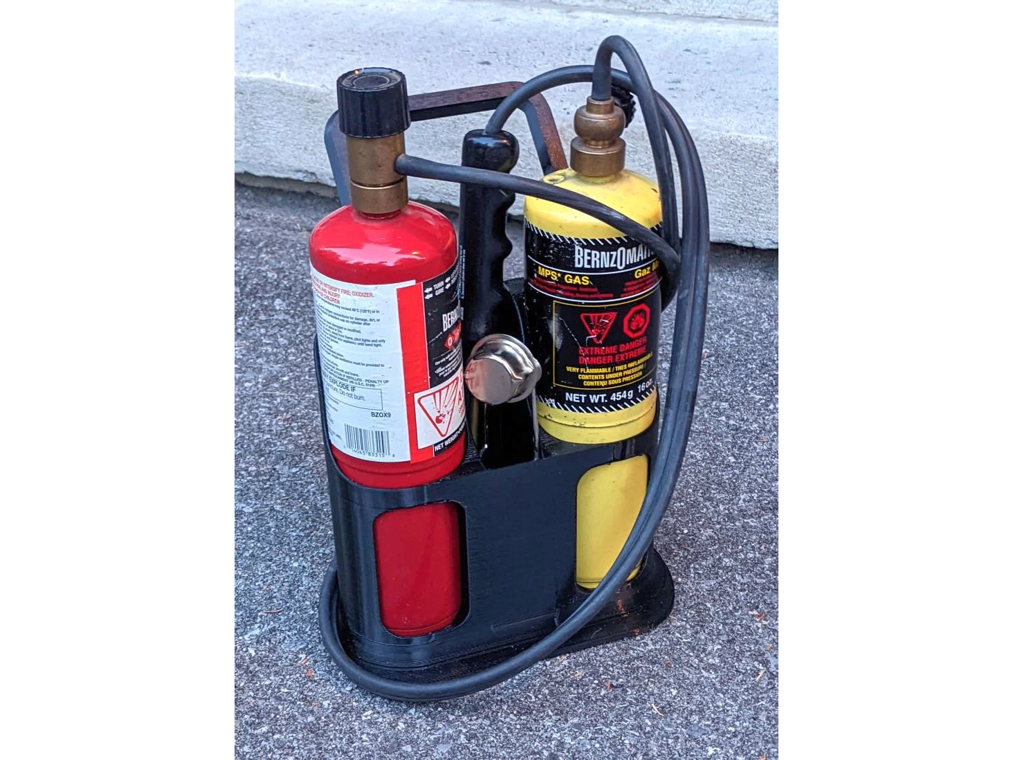 Đây là giá đỡ cho bình khò Oxy-Mapp hoặc Oxy-Propane, được tích hợp tay cầm tiện lợi cùng một ngăn chứa bật lửa và đầu khò khi không sử dụng.