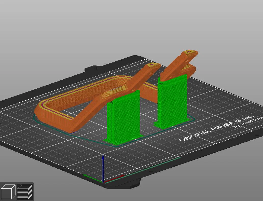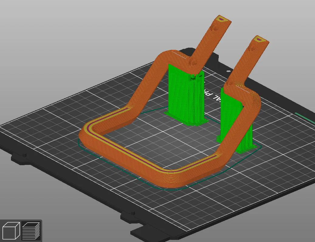 Tốt nhất bạn nên in tay cầm theo hướng hiển thị trong ảnh chụp màn hình đính kèm. Cách này giúp bề mặt tay cầm nhẵn mịn nhất mà không cần tạo support hay bridge ở khu vực cầm nắm. Tôi đã sử dụng 4 đường viền (perimeters) cho tay cầm để tăng thêm độ cứng cáp. Nếu bạn in bằng đầu phun 0.4mm tiêu chuẩn, bạn nên tăng số đường viền hoặc mật độ infill cao hơn nữa.