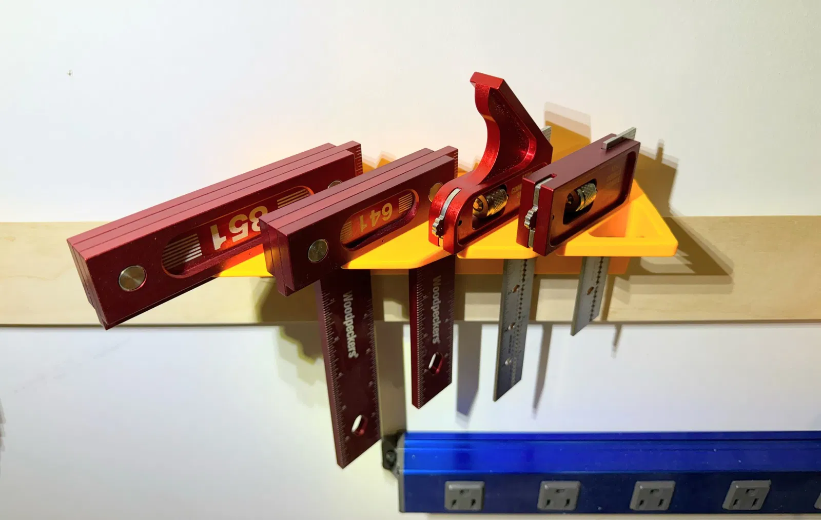 Holds your woodworking square on the wall or in 3/4in french cleat at 45 degree angle for both display and easy access