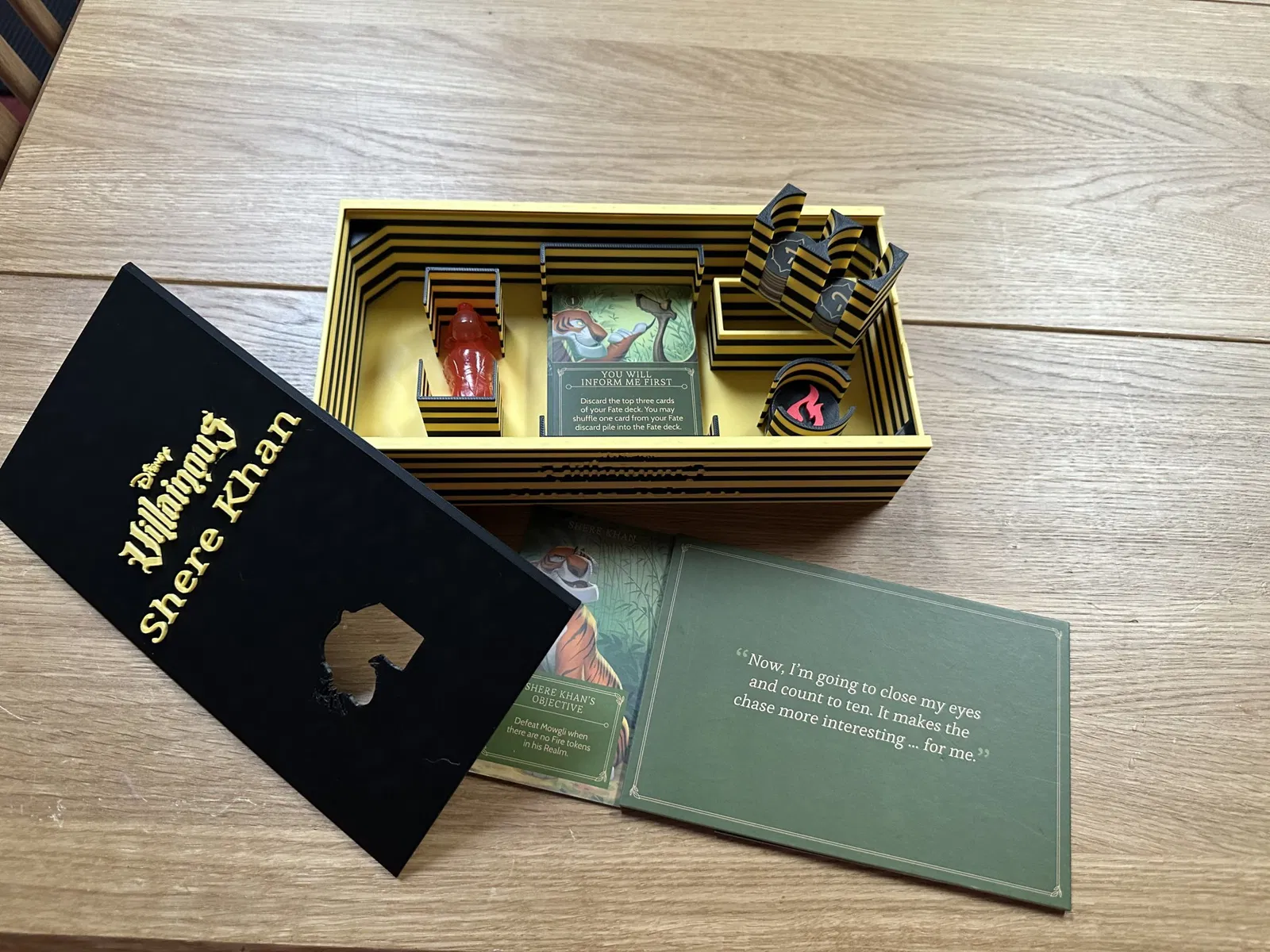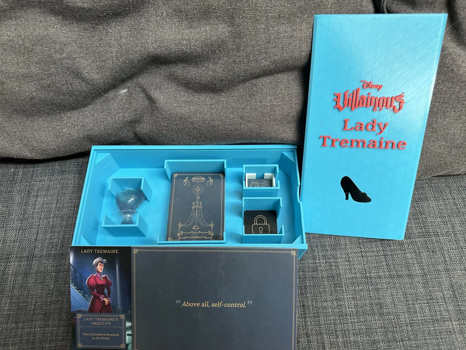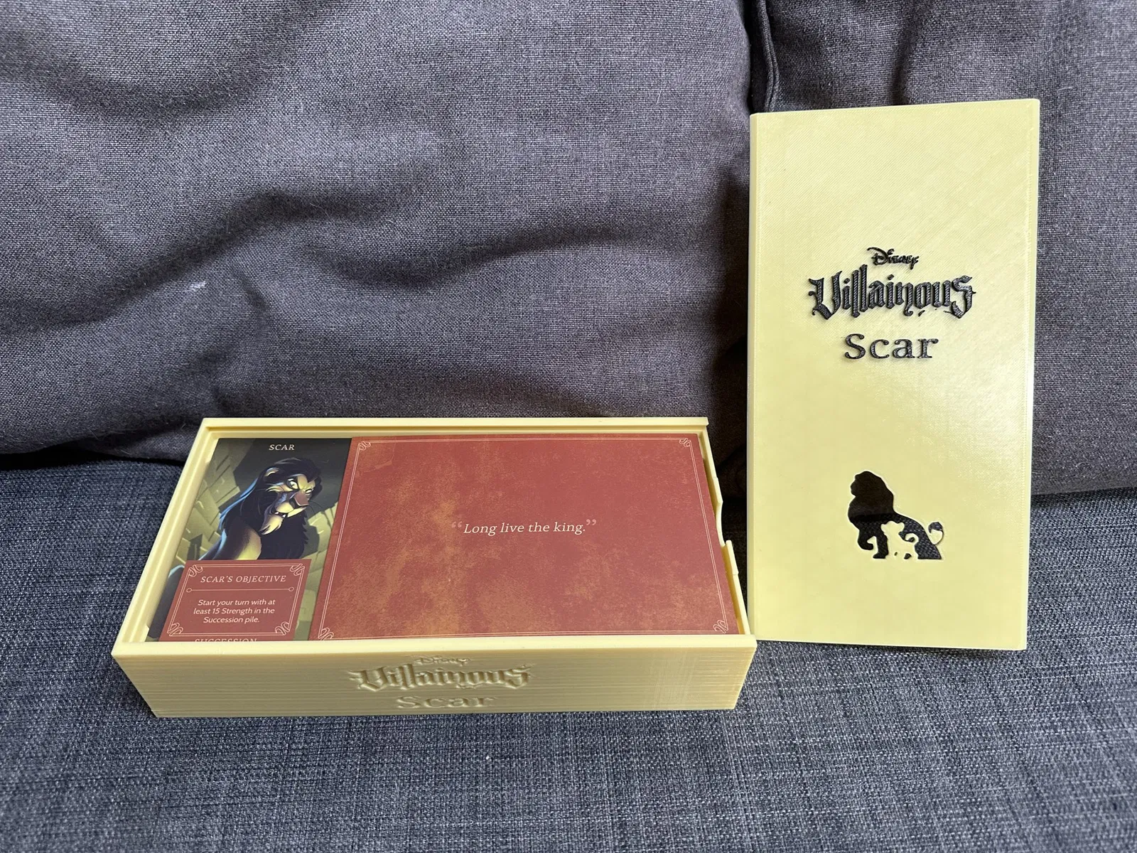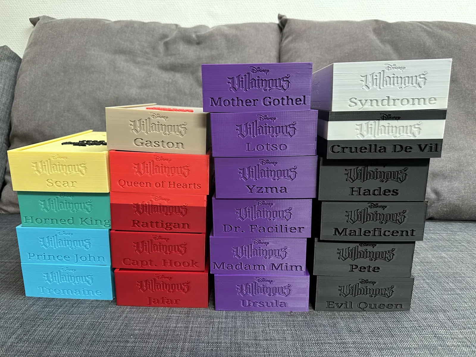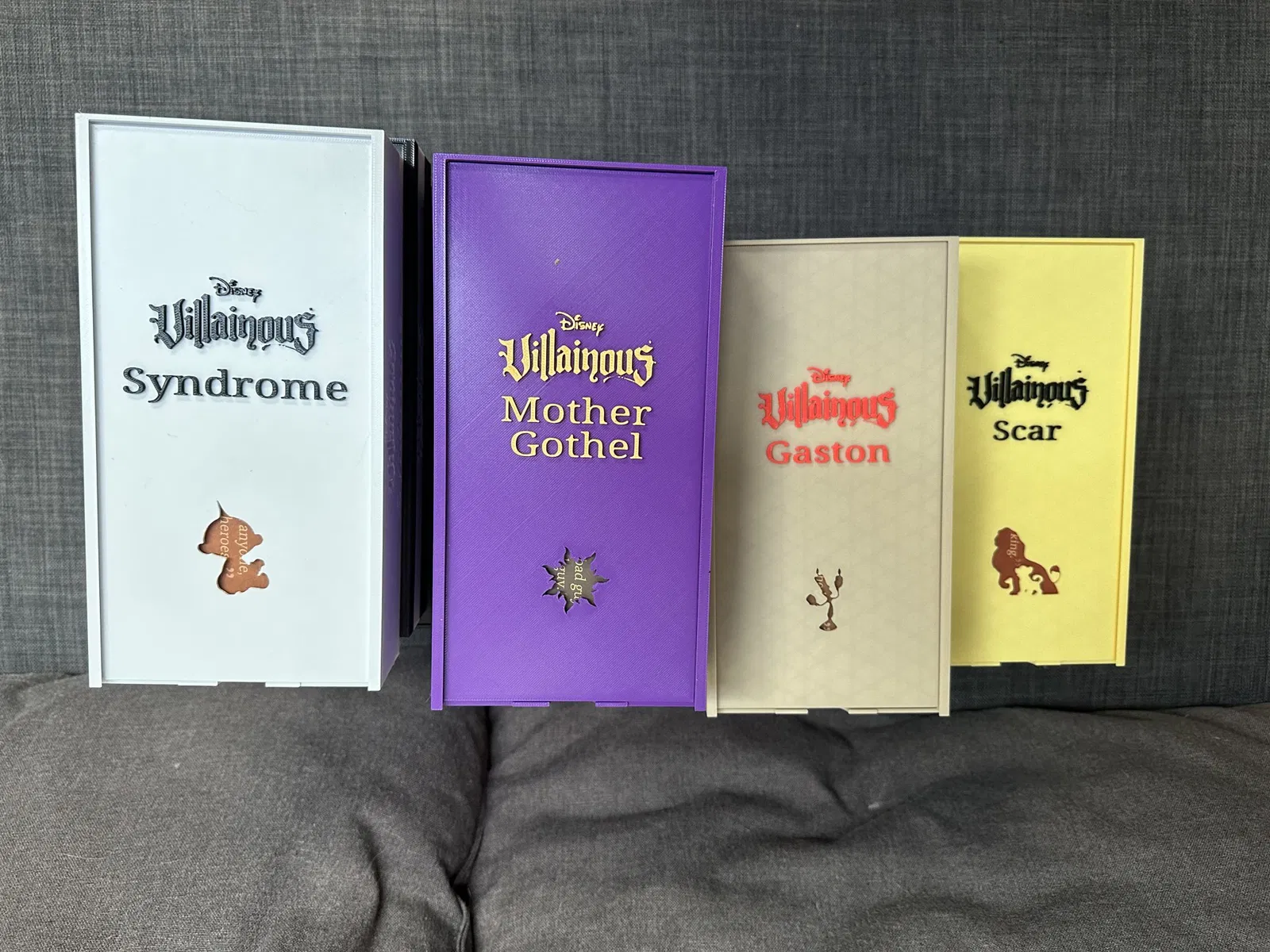 Khi chúng tôi đã có tất cả các bản mở rộng Villainous, phần chèn mà tôi đã làm trước đó không còn hiệu quả nữa. Vì vậy, tôi đã quyết định thiết kế một hộp cho mỗi ác nhân. Các hộp này gần như độc đáo cho mỗi ác nhân, chứa thẻ, token và các thứ cần thiết khác. [Ghi chú cập nhật đã bị xóa để rõ ràng trong bản dịch]