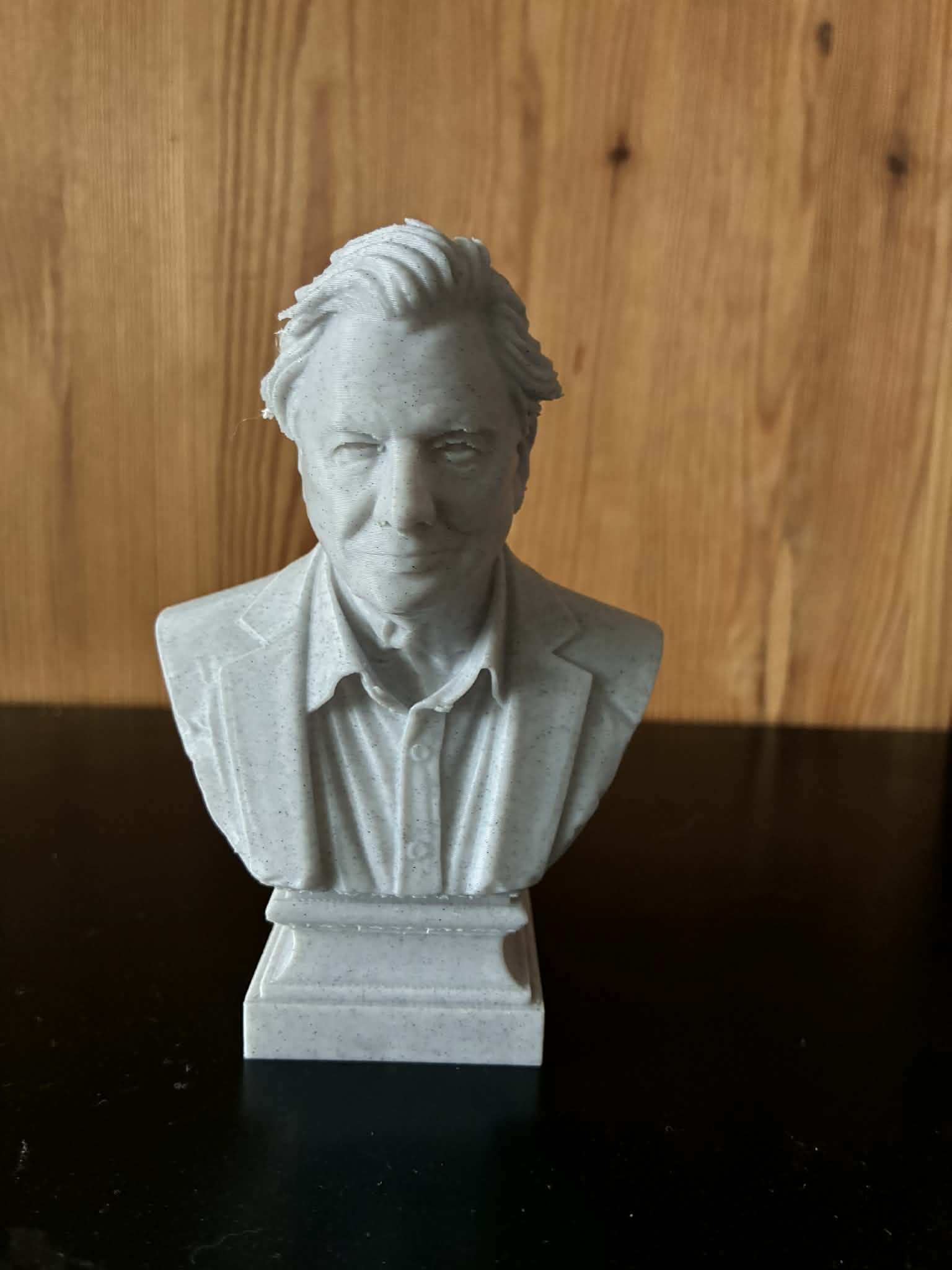 Tượng bán thân đầy tinh tế của nhà tự nhiên học huyền thoại David Attenborough. Tác phẩm in 3D này tái hiện chân thực gương mặt và thần thái thông thái của ông, một sự tri ân dành cho người đã truyền cảm hứng yêu thiên nhiên cho cả thế giới.