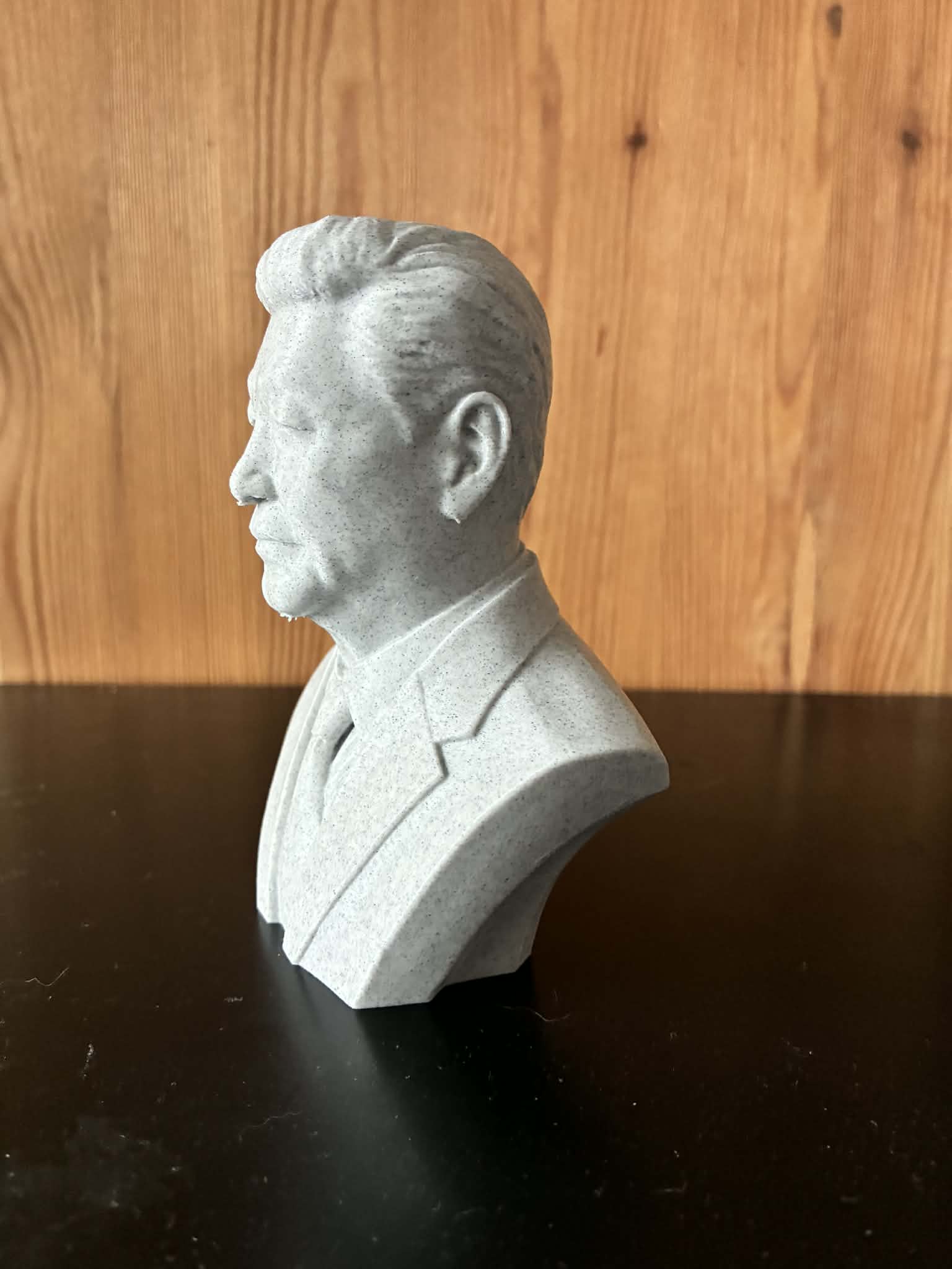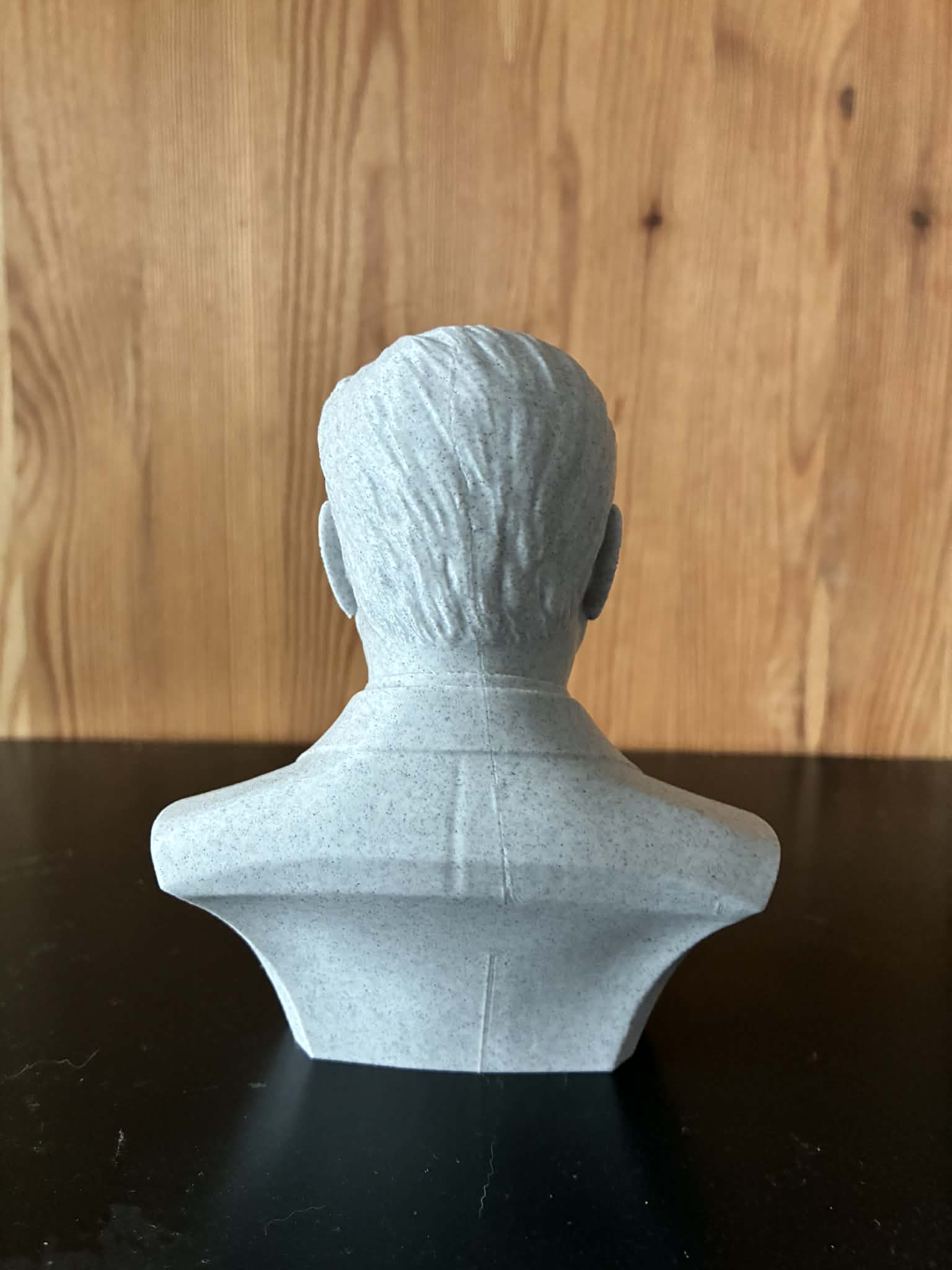 Mẫu in 3D này mang đến một góc nhìn điêu khắc cổ điển, làm nổi bật các khối hình sắc nét và giúp người xem dễ dàng nhận diện gương mặt. Biểu cảm điềm tĩnh và có kiểm soát của nhân vật càng làm tăng thêm vẻ uy nghiêm và thần thái. Tổng thể bức tượng tuân thủ các quy tắc tạo hình truyền thống, mang lại một tác phẩm hài hòa, tinh tế và đầy tính thời đại.