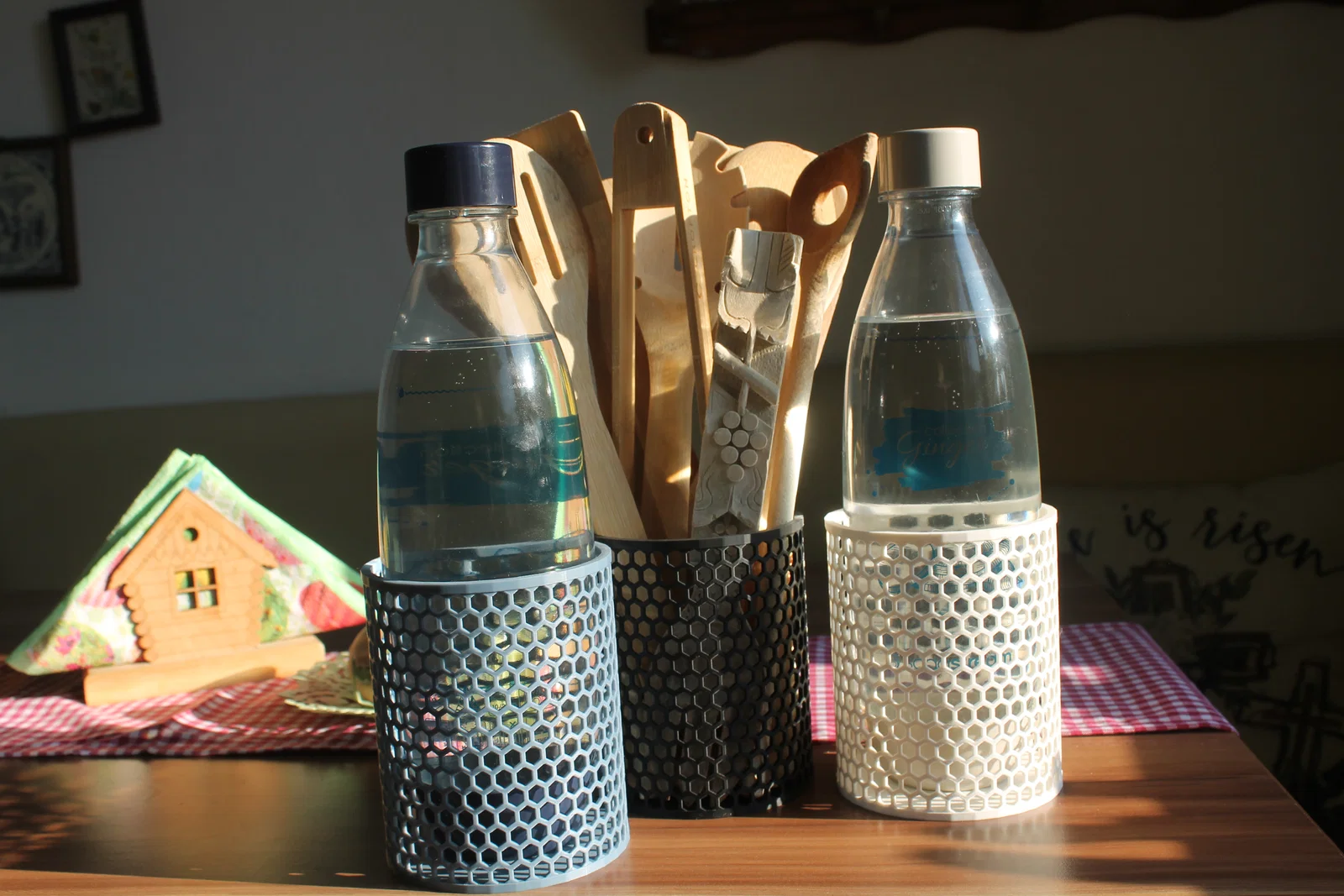 Được in trên máy Bambu P1S với các cài đặt thông dụng (chiều cao lớp in 0.2mm), sử dụng nhựa Bambu Lab Matte màu đen than (charcoal black), trắng ngọc (jade white) và xanh xám (blue-grey).