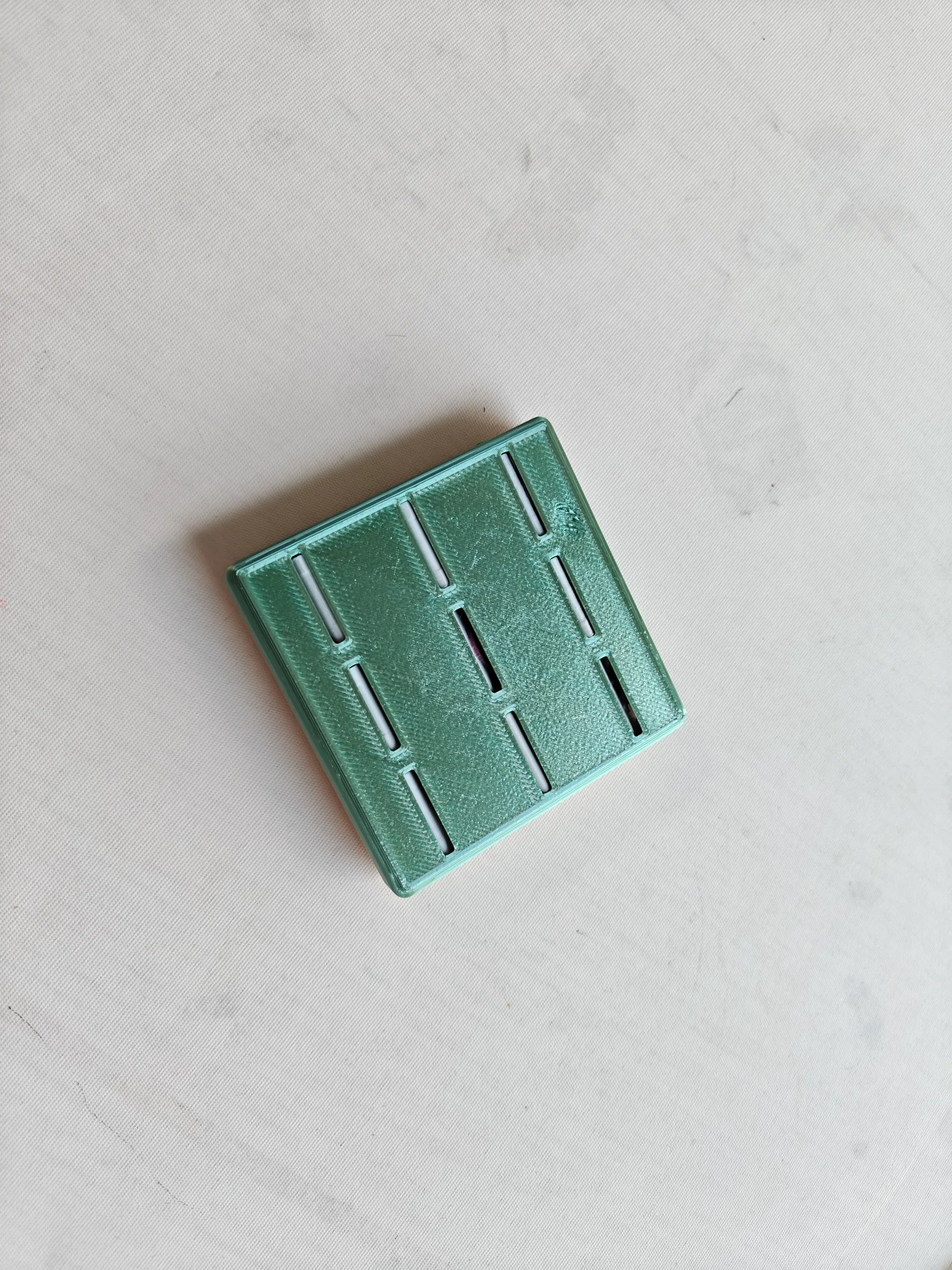 Sau khi in xong tất cả các bộ phận, bạn cần ba đoạn dây nhựa (filament) để làm trục cố định các mảnh ghép vào đế. Làm nóng nhẹ và tán dẹt hai đầu dây nhựa để giữ chặt các mảnh ghép tại chỗ. Các chi tiết nổi 3D có thể được tô màu bằng bút acrylic.