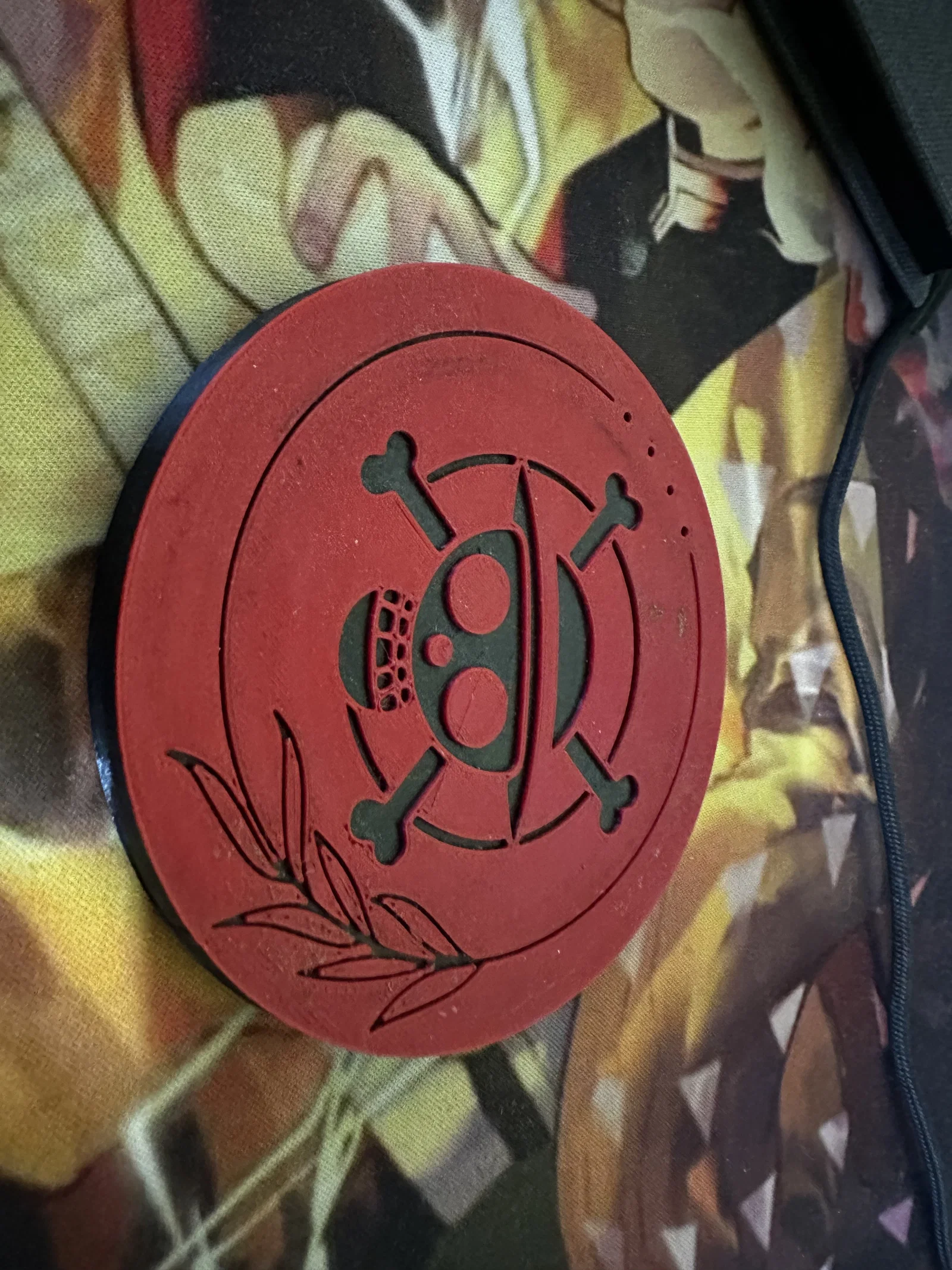 Đế lót ly này được thiết kế với hình tròn đơn giản nhưng tinh tế, bề mặt nổi bật với chi tiết logo đầu lâu được cắt khắc sắc nét. Bạn có thể dễ dàng in ấn bằng công nghệ 3D để tạo ra những chiếc đế lót ly đa sắc màu, phối màu giữa phần nền và họa tiết để làm nổi bật biểu tượng chính. Với kích thước nhỏ gọn, nó hoàn toàn phù hợp để đặt trên bàn máy tính, bàn trà hoặc làm quà tặng ý nghĩa cho những người bạn cùng chung đam mê với thế giới hải tặc One Piece.