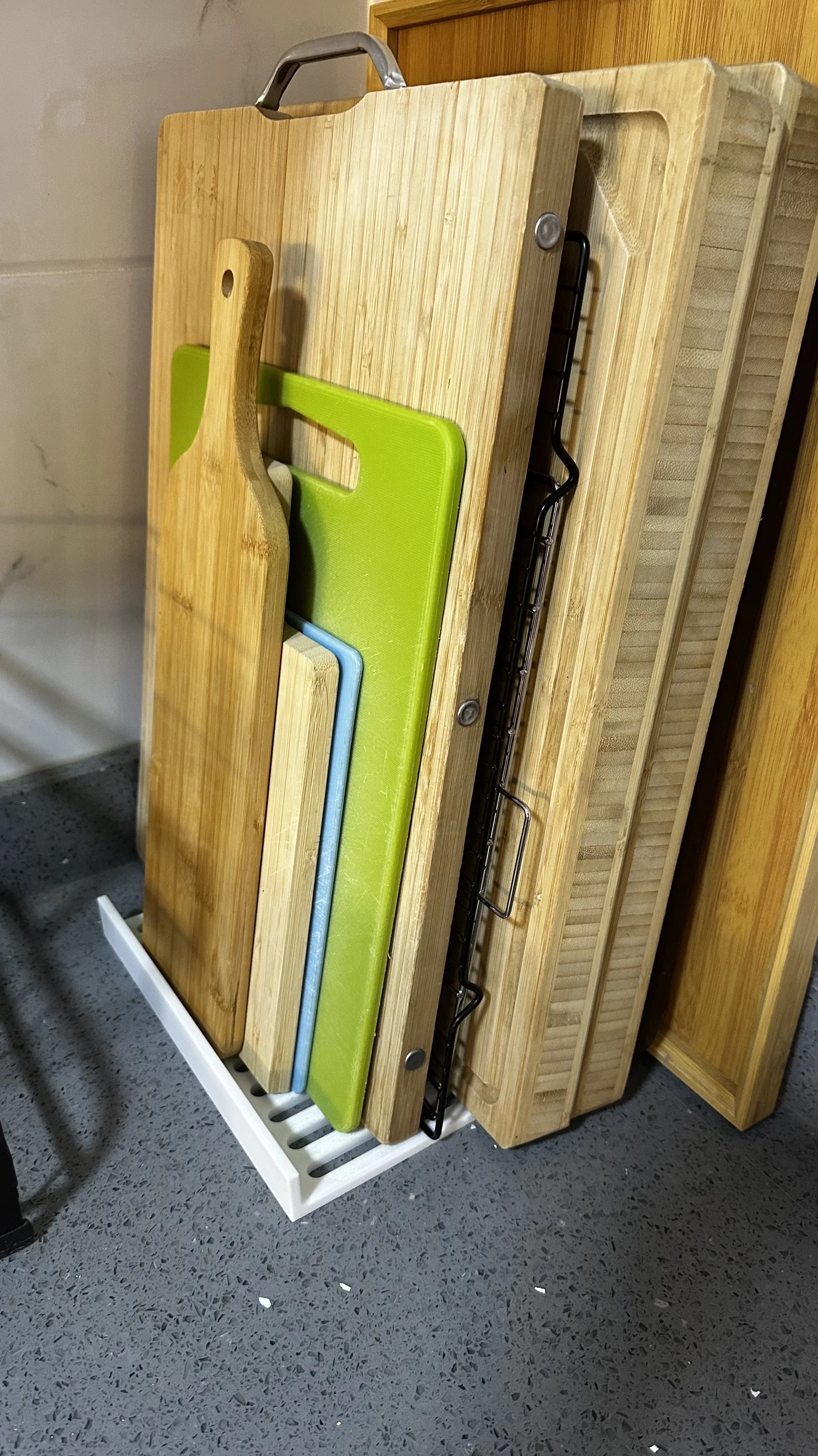 Trong căn bếp hiện tại của mình, mấy cái thớt toàn để lộn xộn trên mặt bàn bếp. Chúng cứ trượt qua trượt lại làm mình khó chịu quá, nên mình đã dành ra 15 phút để thiết kế cái giá đỡ này trong Fusion và cho máy in chạy mất khoảng 7 tiếng. Thế là xong, hết phiền phức luôn!
