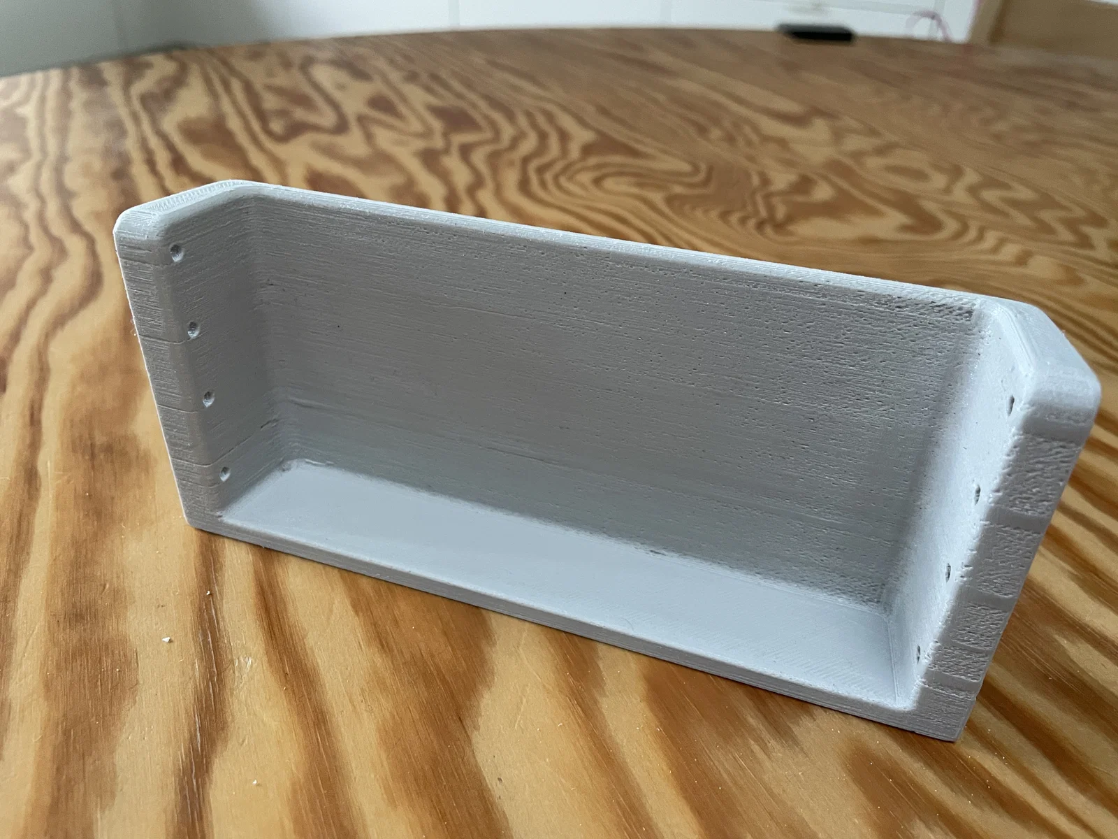 Kệ đựng gia vị dành cho tấm che kitchenette của xe VW T5. Thiết kế này không bị nhô ra ngoài, nên bạn vẫn có thể mở tấm che bình thường (khi kệ trống). Bạn hãy dùng một đoạn dây thun bungee 3mm để giữ các lọ gia vị và cố định kệ bằng băng keo hai mặt nhé.