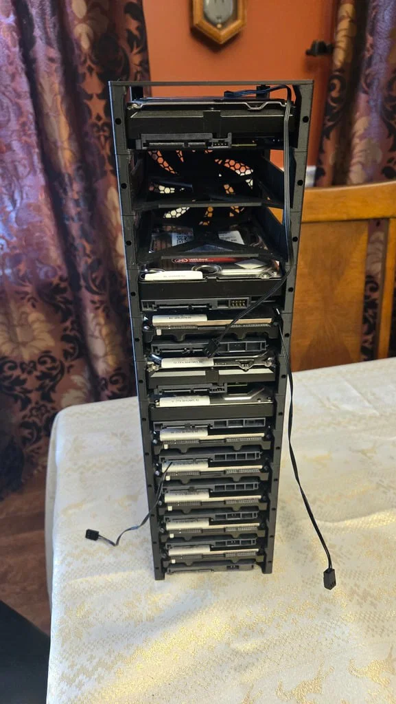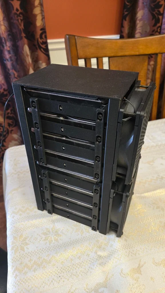 Giải pháp lưu trữ ổ cứng thông minh dành cho máy chủ media của bạn. Thiết kế dạng mô-đun cho phép xếp chồng linh hoạt, có sẵn chỗ gắn quạt 120mm để tản nhiệt tối ưu mà không cần đến thùng máy cồng kềnh. Dễ in, không cần support.