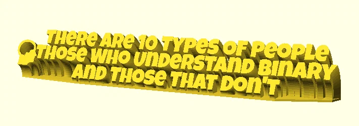 Bạn là một người yêu thích công nghệ, dân lập trình chính hiệu hay chỉ đơn giản muốn tạo điểm nhấn thú vị cho góc làm việc của mình? Mẫu in 3D này chính là lựa chọn hoàn hảo để bạn thể hiện cá tính riêng một cách đầy hóm hỉnh. Câu nói nổi tiếng "There are 10 types of people: those who understand binary, and those who don't" từ lâu đã trở thành một biểu tượng trong cộng đồng IT, vì số 10 trong hệ nhị phân chính là số 2 trong hệ thập phân. Đây không chỉ là một món đồ trang trí đơn thuần mà còn là cách để bạn tìm kiếm "đồng minh" cùng tần số ngay tại văn phòng.