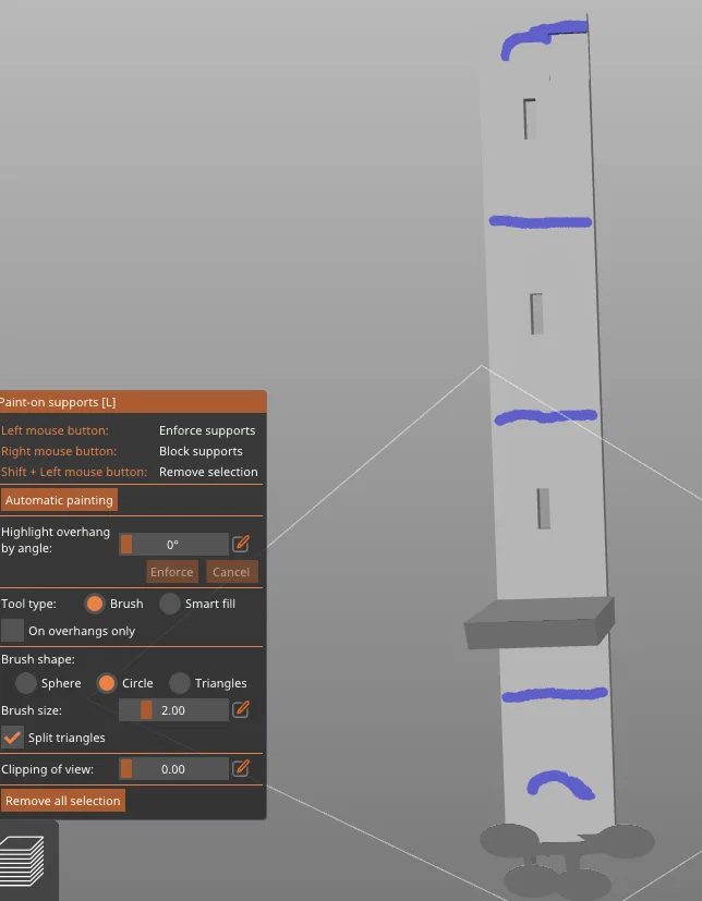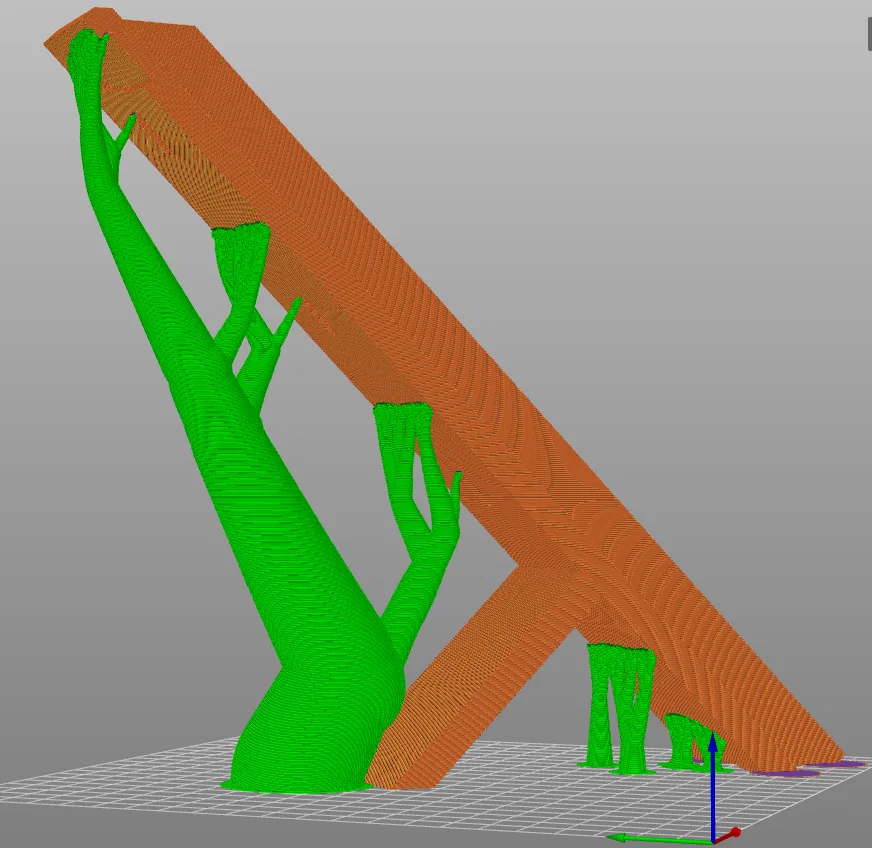 Mẫu này yêu cầu bàn in có kích thước tối thiểu là 220mm x 220mm x 220mm. Hướng in của tệp ShelfBracketV2_ReadyToPrint.stl sẽ mang lại độ bền tối ưu vì giá đỡ này sẽ chịu lực theo hai trục khi được lắp vào tủ lạnh. Nếu in theo hướng này, bạn hãy thêm hỗ trợ (supports) dạng cây (organic tree supports) như hình minh họa. Nếu bạn có bàn in lớn (ví dụ: 300mm x 300mm), tệp ShelfBracketV2.stl có thể được in ở mặt sau. Tuy nhiên, hãy lưu ý rằng các lớp in có thể dễ bị ảnh hưởng bởi áp lực tại vị trí giá đỡ gắn vào vách tủ lạnh. Tệp "ReadyToPrint" sẽ ít bị ảnh hưởng bởi các áp lực này hơn. Thiết lập in khuyến nghị: Độ cao lớp in (layer height): 0.2 mm 5 lớp tường (wall perimeters) Bật hỗ trợ dạng hữu cơ (organic supports) Mật độ lấp đầy (infill density): 25%