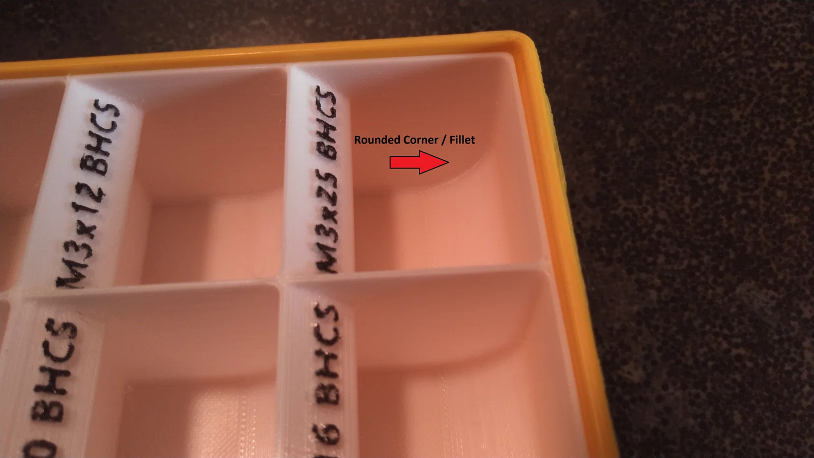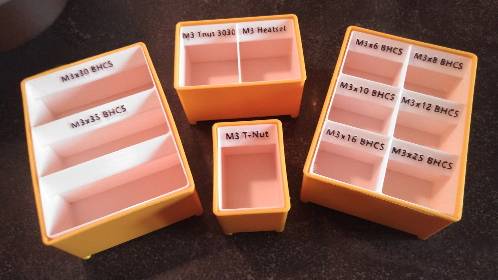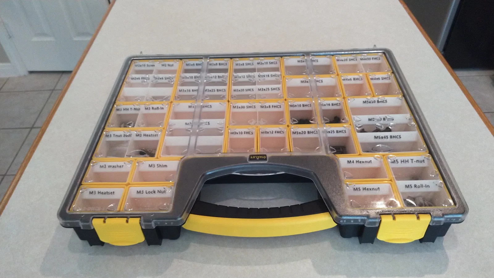 Lưu ý: Dự án này vẫn đang trong quá trình hoàn thiện. Mình đang tích cực cập nhật cách sắp xếp khay, bao gồm các tệp STL mới để gộp các khay vừa/nhỏ thành một khay lớn in toàn phần, có sẵn các ngăn chứa bên trong. Các tệp STL được cung cấp bao gồm các khay lưu trữ có thể in được, dùng để lắp vào bên trong các ngăn của hộp Stanley Organizer (mẫu 014725R). Các khay này cung cấp chỗ lưu trữ cho tất cả các loại ốc vít được liệt kê trong danh sách linh kiện BOM của tất cả các máy in Voron (2.4, Trident, V0, Switchwire và Enderwire). Chỉ với một hộp Stanley Organizer, bạn đã có thể giải quyết gọn gàng vấn đề lưu trữ linh kiện cho tất cả máy in Voron của mình. Mỗi khay đều có nhãn dập nổi ghi rõ loại và kích thước ốc vít. Tất cả các khay đều được thiết kế bo tròn góc (fillet) giúp việc lấy linh kiện ra ngoài dễ dàng hơn (nếu bạn từng thử lấy con ốc hay vòng đệm nhỏ xíu cuối cùng ra khỏi hộp, bạn sẽ thấy thiết kế bo góc này cực kỳ hữu ích!). Các tệp STL, 3MF, Step và FreeCAD đều được bao gồm đầy đủ. Tệp 3MF có tên StanleyOrganizer_VoronFasteners.3mf đã sắp xếp sẵn tất cả các khay để vừa vặn với hộp Stanley. Bạn có thể thay đổi văn bản trên nhãn dập nổi ngay trong tệp 3MF này. Ngoài ra, tệp StanleyOrganizer_GenericInserts.3mf cũng được cung cấp để bạn tùy chỉnh các ngăn chứa theo nhu cầu cá nhân. Tổng lượng nhựa in cho toàn bộ các khay khoảng 375 gram.
